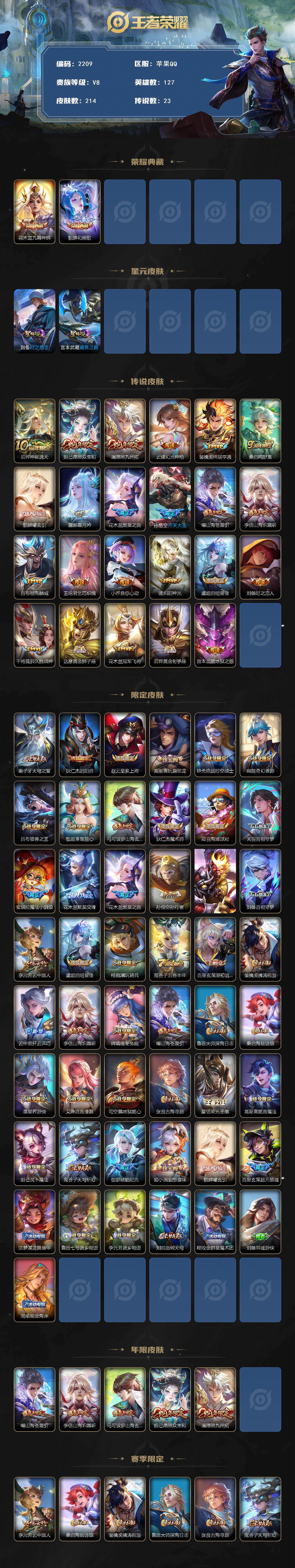 苹果Q-V8-最强王者段位-127英雄-214皮肤-2典藏皮肤-23传说-57史诗