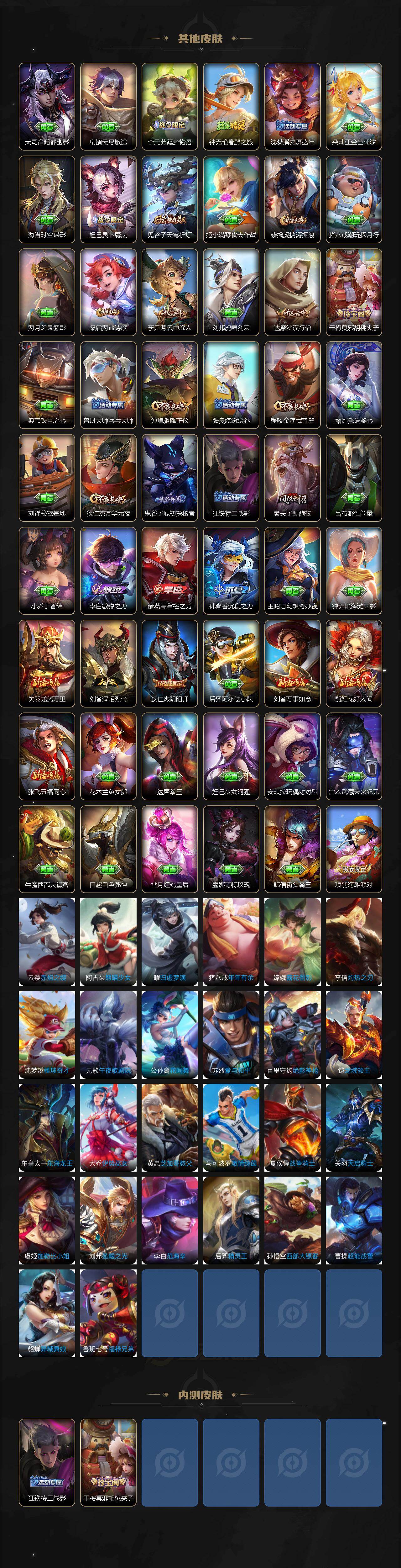 【传说皮肤】:阿轲罗刹妄海,韩信踏浪归,云缨神骥越千峰,关羽神骥镇沧海,貂蝉神骥聚万邦,马超神骥逐星野,李元芳星君娄金,后羿神树通天,亚连落雪白狼,典韦战鼓燎原,澜逐花归海,露娜霜月吟,孙悟空齐天大圣,王昭君星穹之声,马超无双飞将,镜炽阳神光,虞姬启明星使,曜云鹰飞将,李信一念神魔,干将