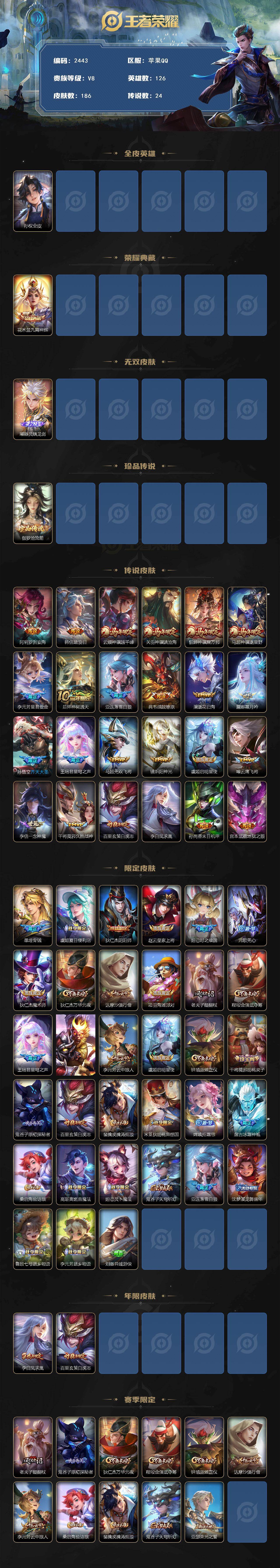苹果Q-V8-最强王者段位-126英雄-186皮肤-1典藏皮肤-1无双-1珍品传说-24传说-60史诗