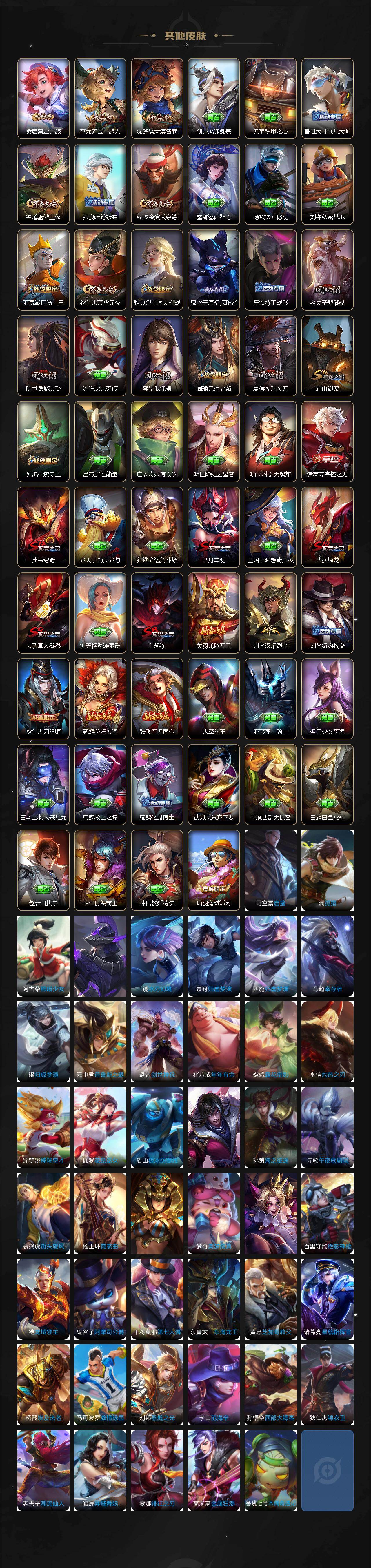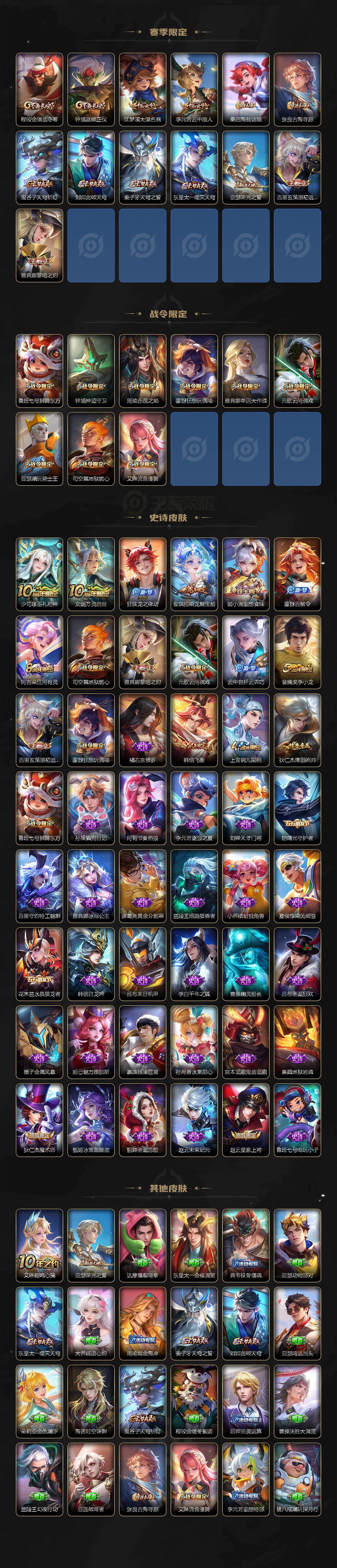 【限定皮肤】:白起狰,大乔绒语心约,姜子牙天穹之誓,狄仁杰阴阳师,赵云皇家上将,鲁班七号狮舞东方,芈月重明,周瑜赤莲之