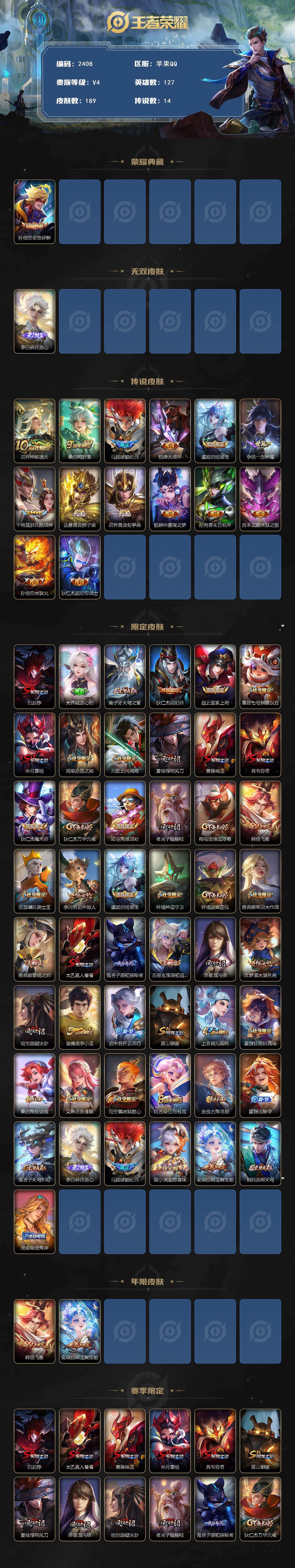 苹果Q-V4-永恒钻石III段位-127英雄-189皮肤-1典藏皮肤-1无双-1