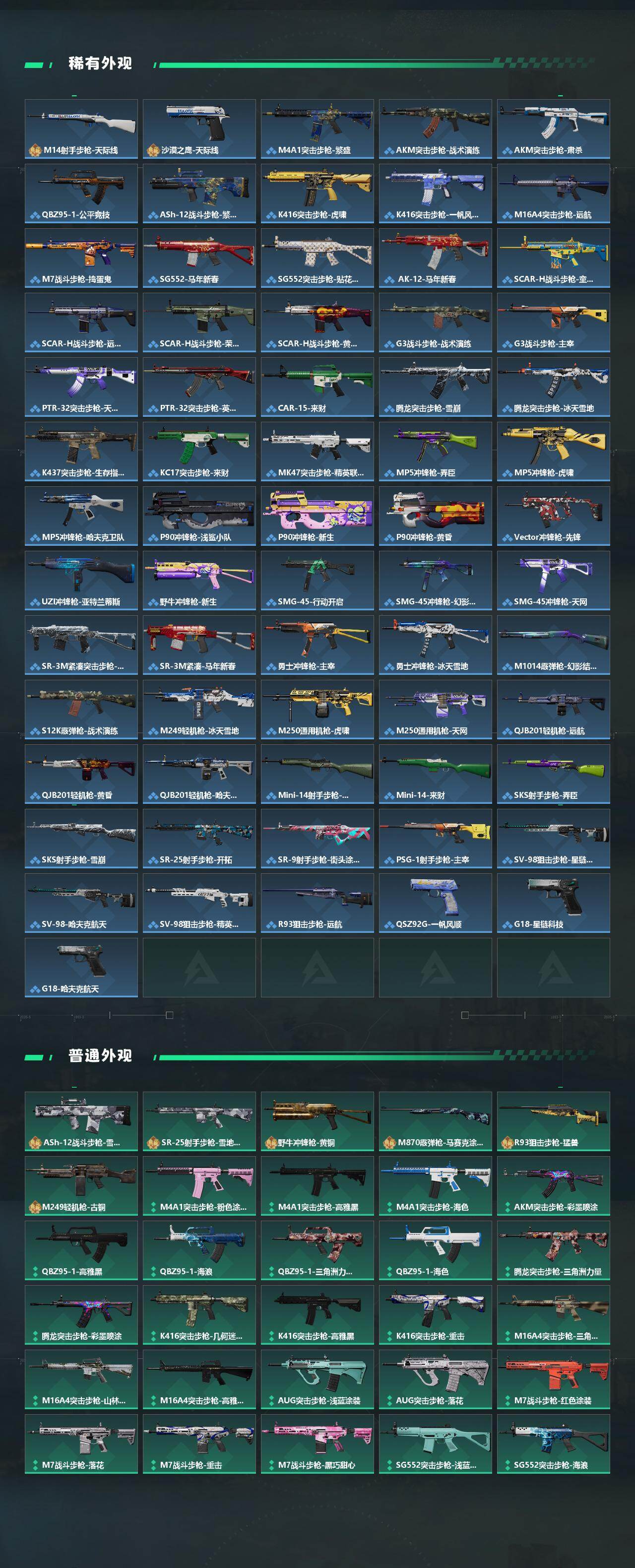 【传说外观】:M4A1突击步枪-蚀金玫瑰,M4A1突击步枪-阿米娅,QBZ95-1突击步枪-凌霄戍卫,SG552突击步枪-运动员,AK-12突击步枪-夜鹰,AK-12突击步枪-特斯拉线圈,SCAR-H战斗步枪-启航,G3战斗步枪-骑士,CA