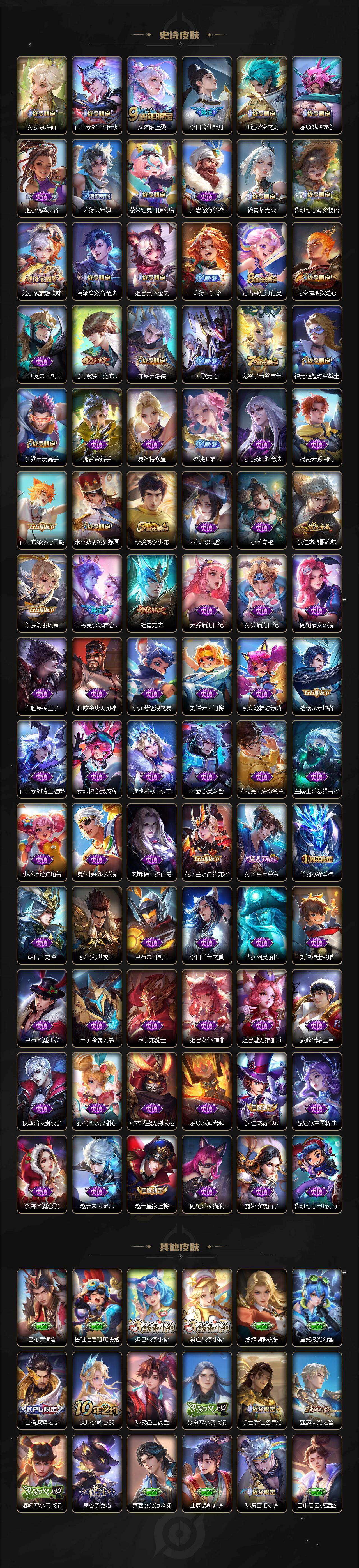 【传说皮肤】:后羿神树通天,澜愿照九州拓,云缨幻光神枪,桑启鸣野蒿,澜逐花归海,马可波罗妄想实况,孙悟空齐天大圣,李信山海炽霜斩,橘右京枫霜尽,马可波罗深海之息,后羿无尽星芒,马超无双飞将,赵云淬星耀世,王昭君乞巧织情,李元芳飞鸢探春,虞姬启明星使,曜云鹰飞将,李信一念神魔,张良黄金白羊座,