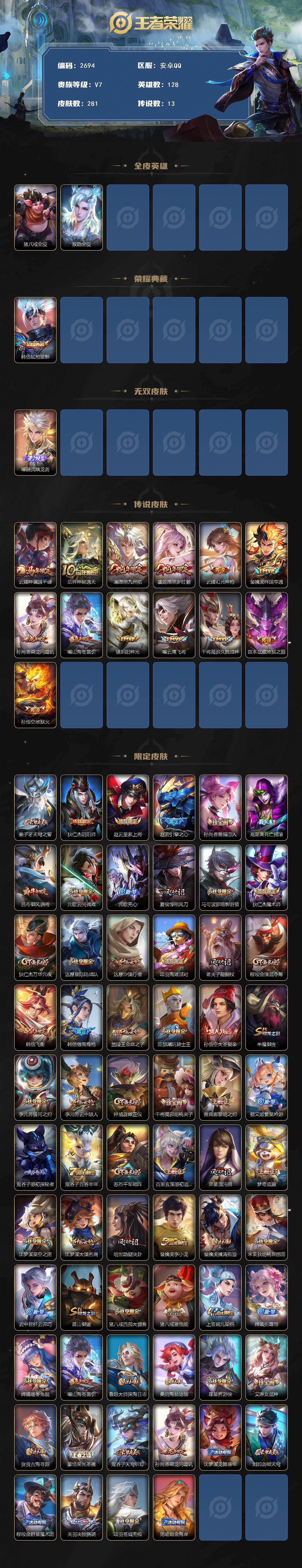【韩信典藏曜无双13个高质量传说多限定6个个性按键】安卓Q-V7-最强王者段位-128英雄-281皮肤-1典藏皮肤-1无双-13传说-82史诗