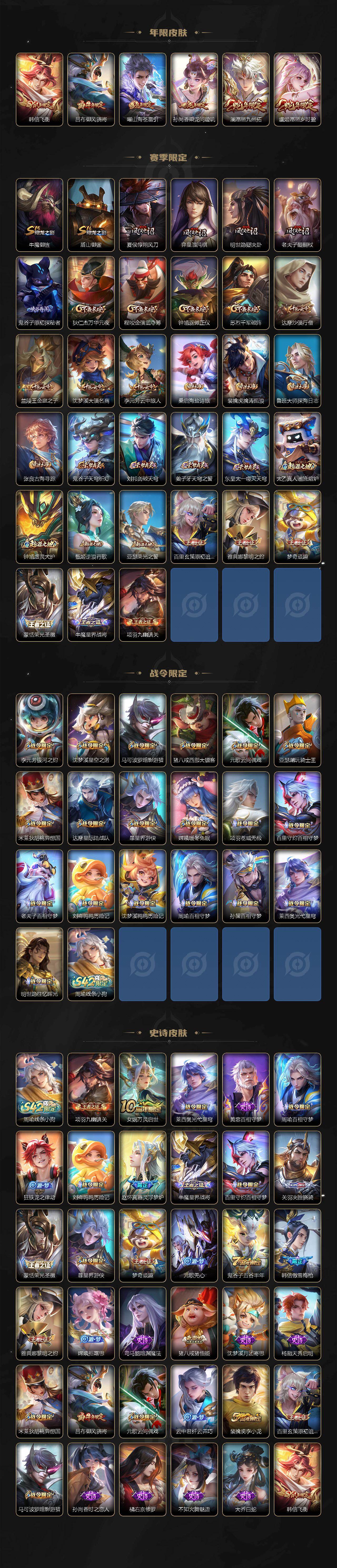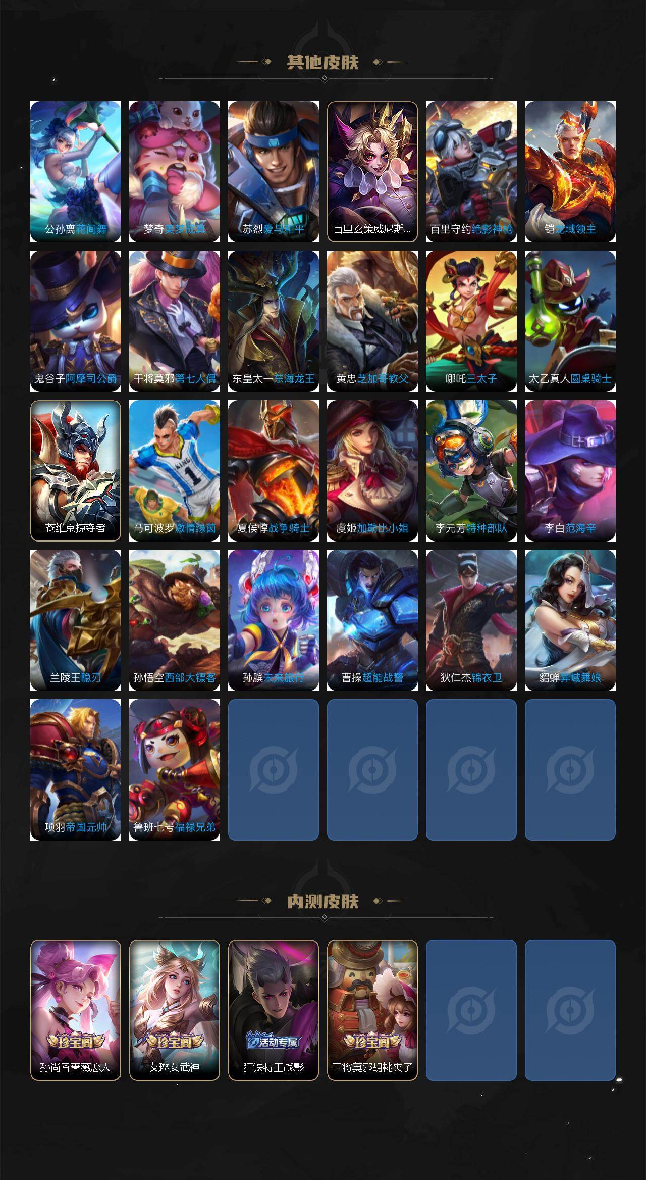 【传说皮肤】:云缨神骥越千峰,后羿神树通天,澜愿照九州拓,虞姬愿照岁时盈,云缨幻光神枪,裴擒虎祥瑞亨通,孙尚香乘龙问璇玑,曜山海苍雷引,镜炽阳神光,曜云鹰飞将,干将莫邪久胜战神,宫本武藏地狱之眼,孙悟空地狱火