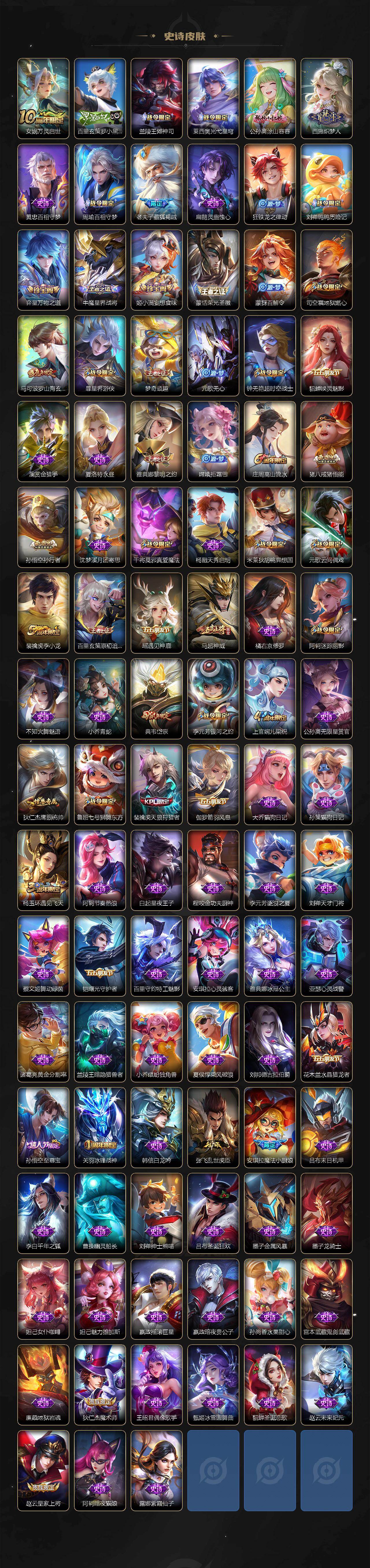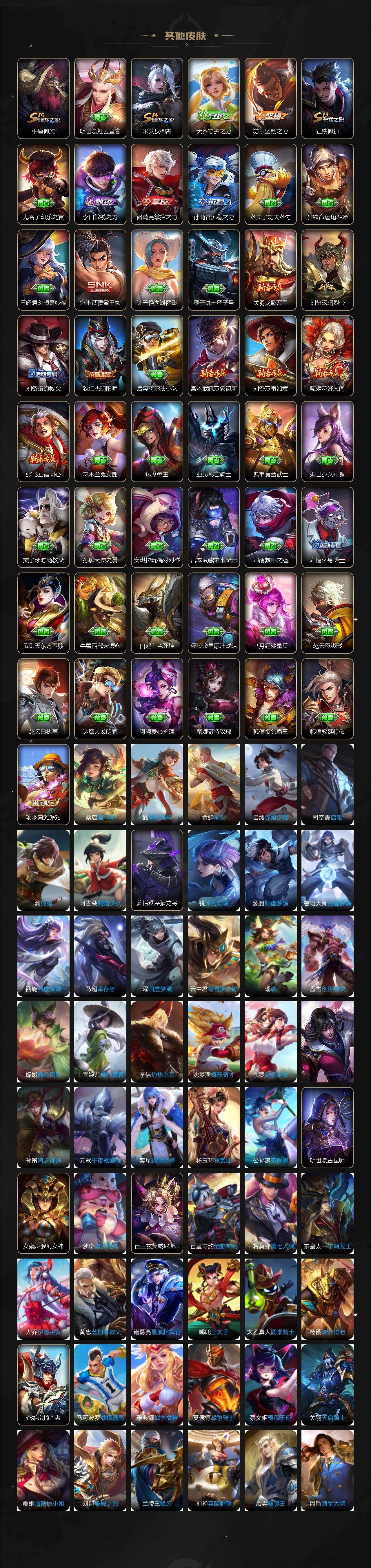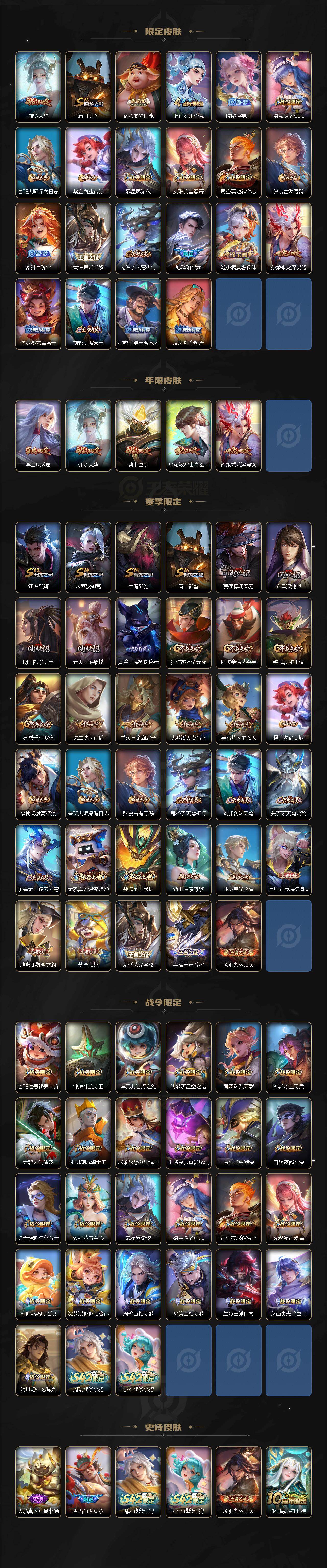 【传说皮肤】:曹操万灵伏威,桑启鸣野蒿,孙策乘龙淬吴钩,铠琥珀纪元,吕布怒海麟威,橘右京枫霜尽,马超无双飞将,孙策末日机甲,镜炽阳神光,虞姬启明星使,曜云鹰飞将,李信一念神魔,伽罗太华,干将莫邪久胜战神,后羿黄金射手座,诸葛亮武陵仙君,李白凤求