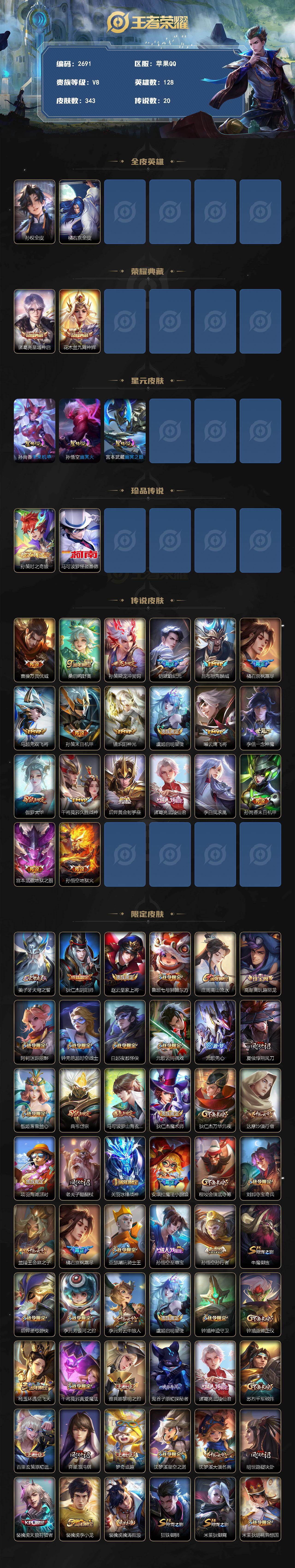 24按键至尊宝冰封战神凤求凰,苹果Q-V8-最强王者段位-128英雄-343皮肤-2典藏皮肤-2珍品传说-20传说-104史诗