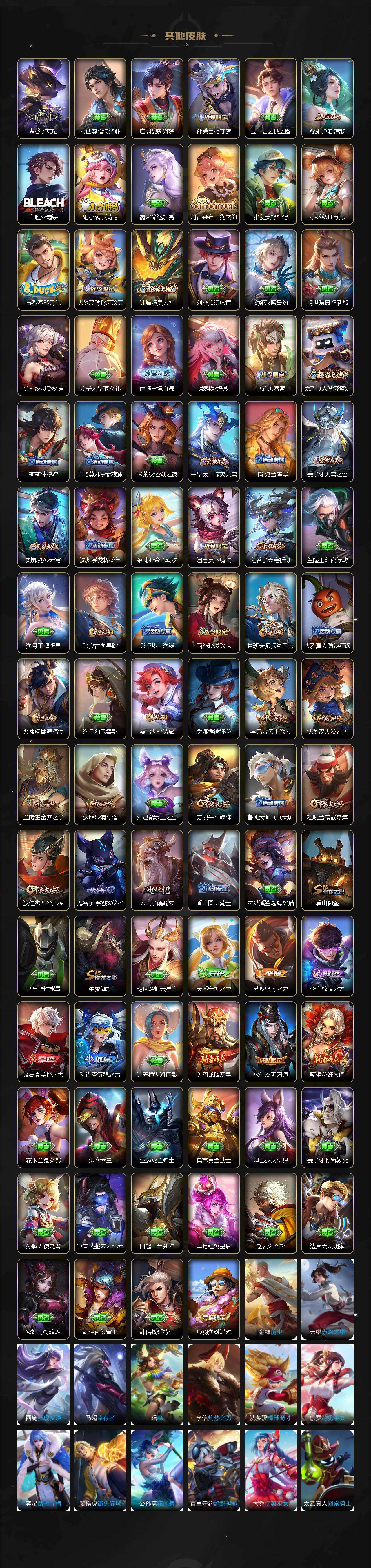 【传说皮肤】:貂蝉神骥聚万邦,杨玉环星之鸣奏,妲己愿照众生和,虞姬愿照岁时盈,云缨幻光神枪,桑启鸣野蒿,瑶时之祈愿,王昭君乞巧织情,小乔音你心动,干将莫邪久胜战神,貂蝉仲夏夜之梦