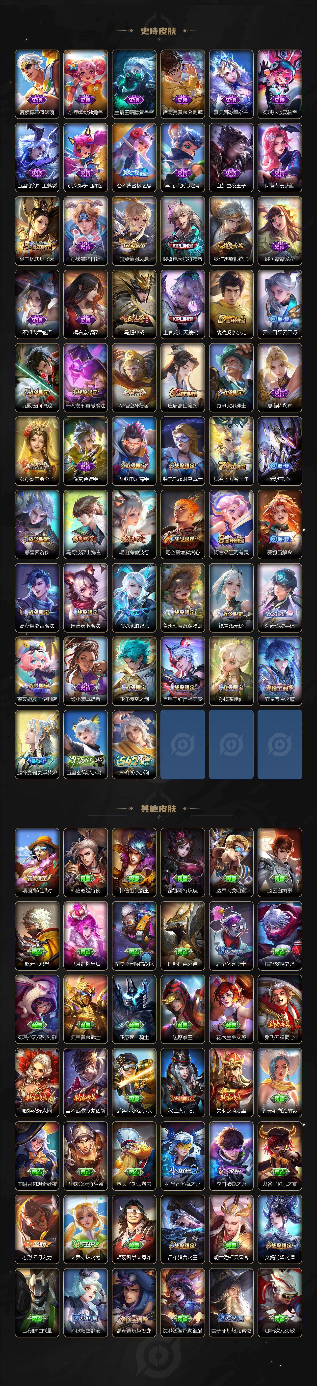 【传说皮肤】:澜愿照九州拓,虞姬愿照岁时盈,裴擒虎祥瑞亨通,桑启鸣野蒿,孙尚香乘龙问璇玑,马超琥珀纪元,澜逐花归海,露娜霜月吟,狄仁杰夜礼服假面,公孙离记忆之芯,小乔山海琳琅生,曜山海苍雷引,李信山海炽霜斩,吕布怒海麟威,李白诗剑行,
