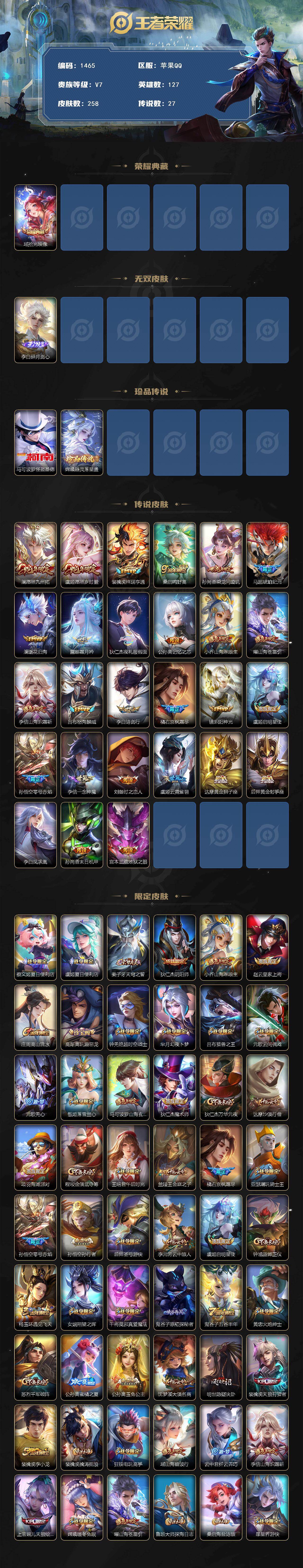 苹果Q-V7-永恒钻石II段位-127英雄-258皮肤-1典藏皮肤-1无双-2珍