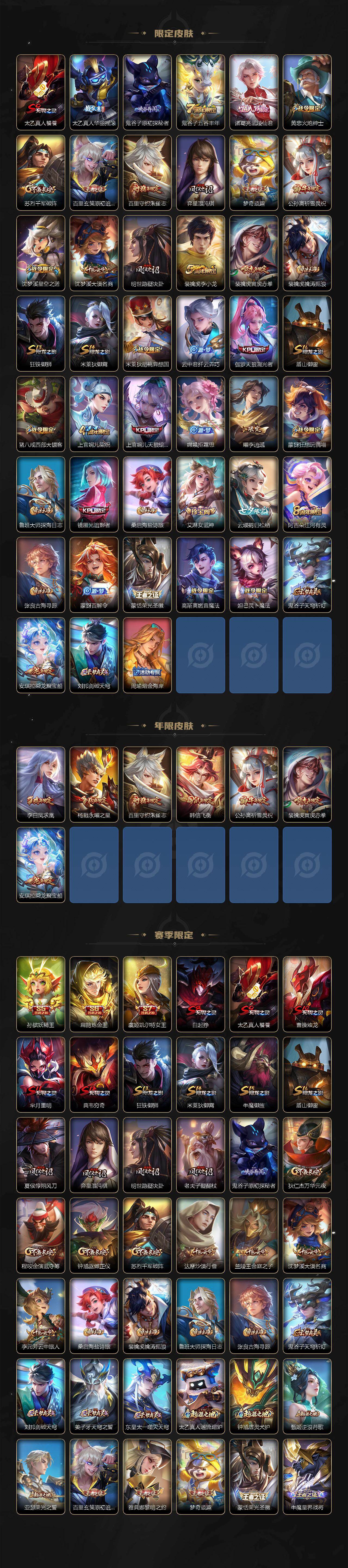【传说皮肤】:桑启鸣野蒿,云缨鹤归松栖,女娲补天,裴擒虎寅虎赤拳,孙尚香异界灵契,赵云淬星耀世,曜李逍遥 ,公孙离祈雪灵祝,虞姬启明星使,孙悟空零号赤焰,关羽武圣,曜云鹰飞将,李信一念神魔,干将莫邪久胜战神,虞姬云霓雀翎,达摩黄金狮子座,花木兰冠军飞将,后羿黄金射手座,杨戬永曜之星,诸葛亮武陵仙君,貂蝉仲夏夜之梦,李白凤求凰,孙尚香末日机甲,孙悟空地狱火