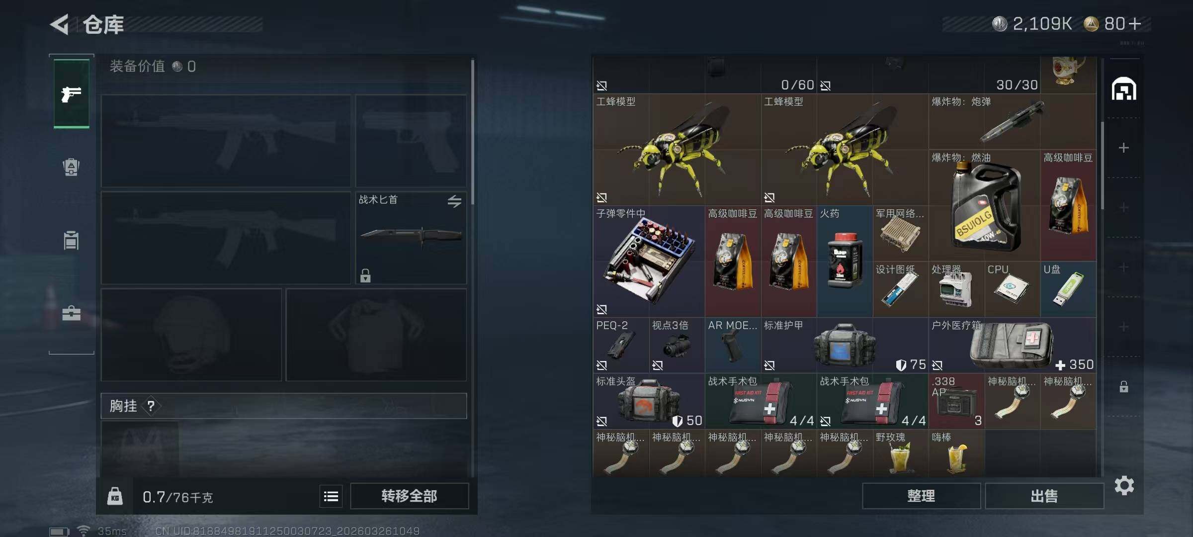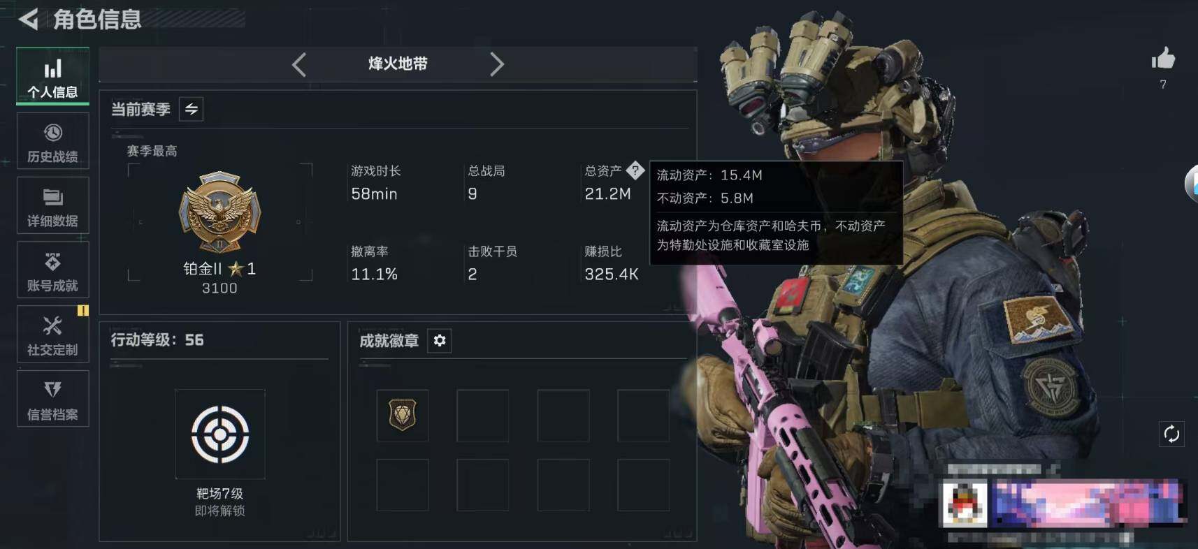 总资产(M):21M/哈夫币(K):2109K/全面战场等级:8_段位:列兵/烽火地带等级:56_段位:铂金/近战-黑鹰/