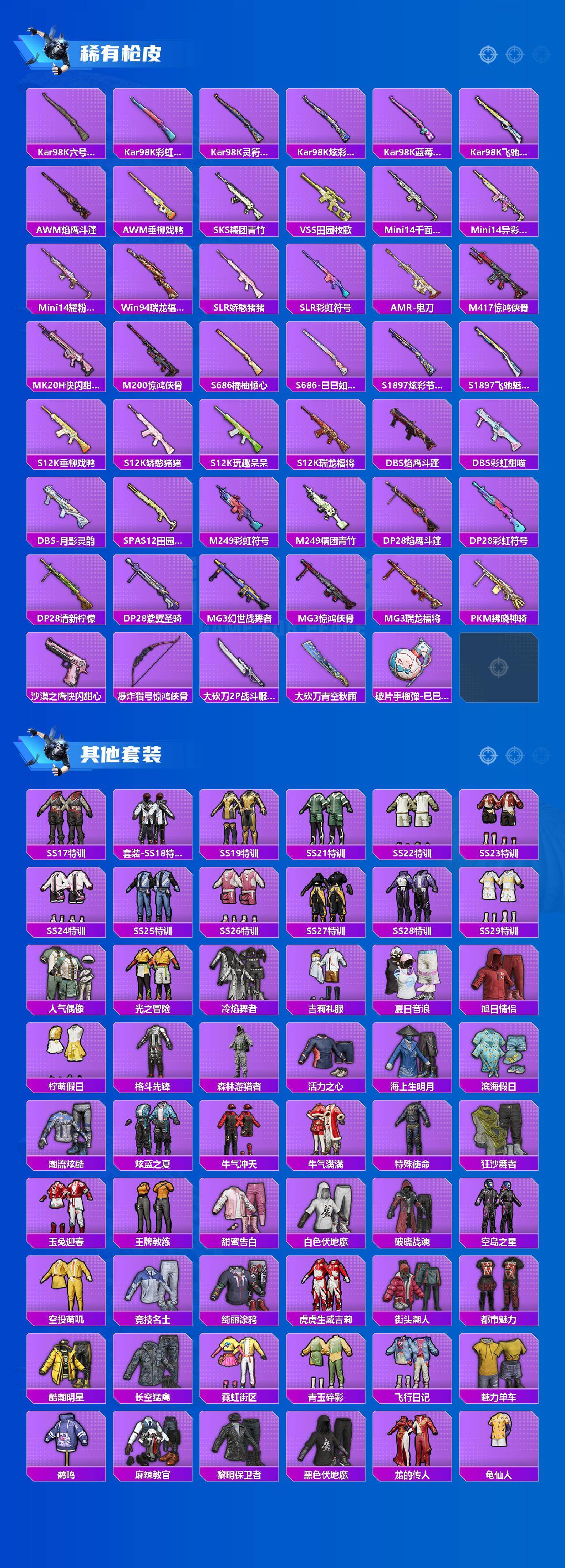 【粉色枪皮等级】:AKM-绿萝繁花(五级),SCAR-L-锦绣绵绵(五级),AUG-暖羊咩咩(五级),Kar98K-巳巳如意(五级),Mk14-福马献瑞(一级),M249-彩虹甜喵(五级),DP-28-豹影疾电(五级)