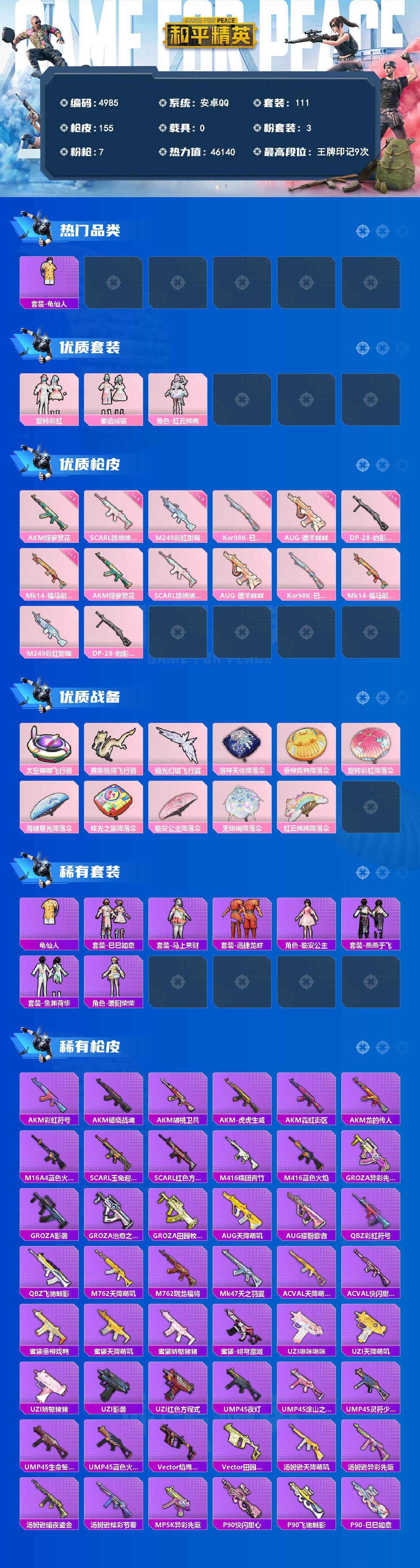 安卓 手Q-3粉装-7特效枪-0载具-3粉色飞行器-46140热力值-9王牌印记-111套装-155枪皮