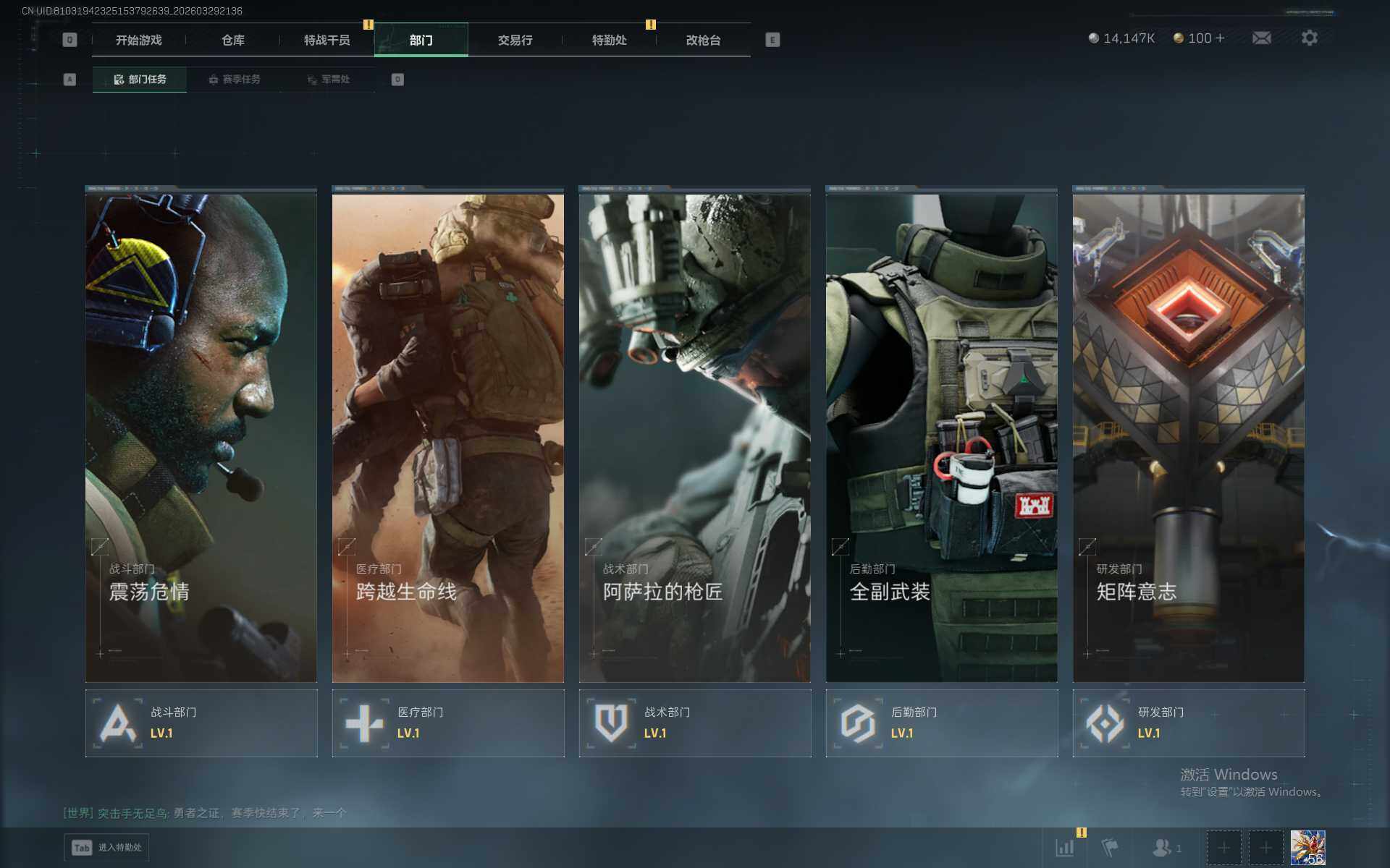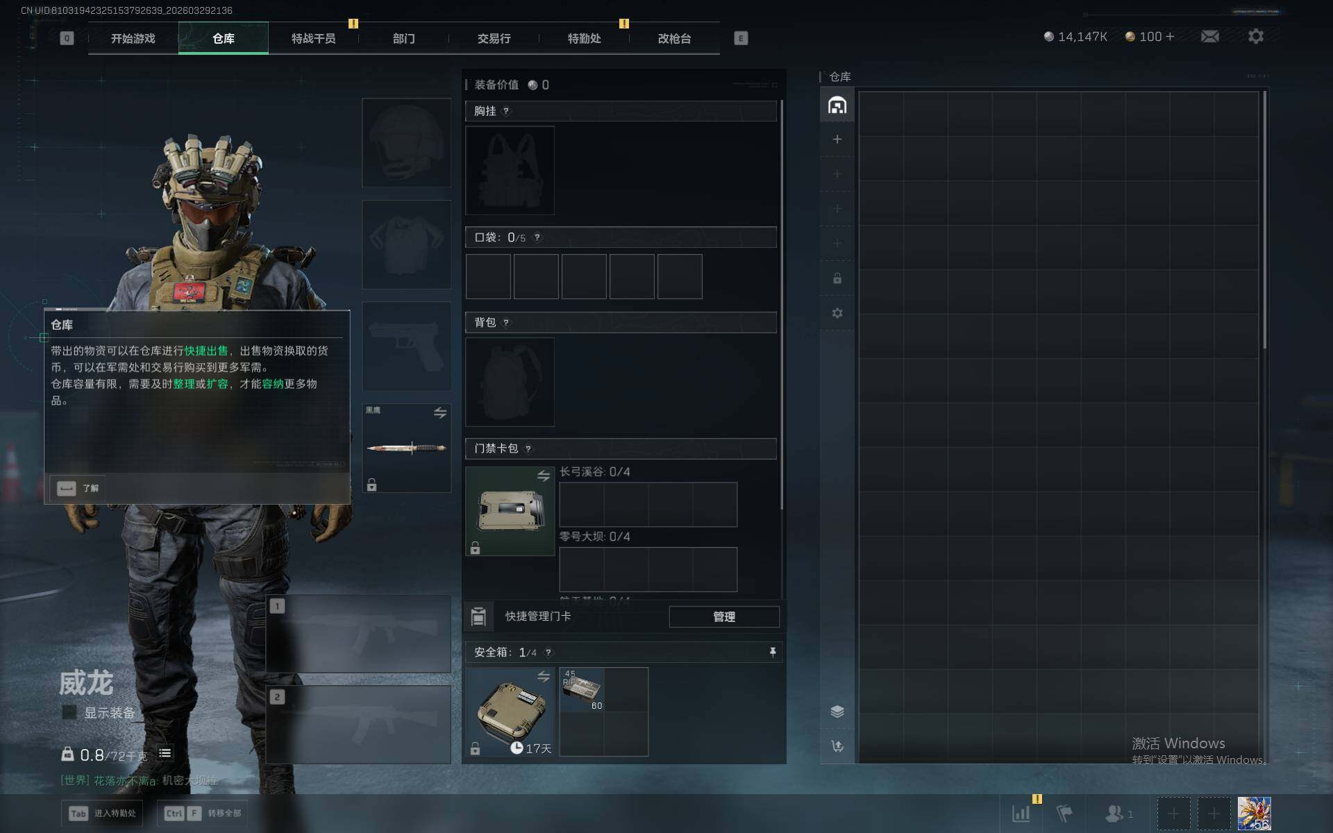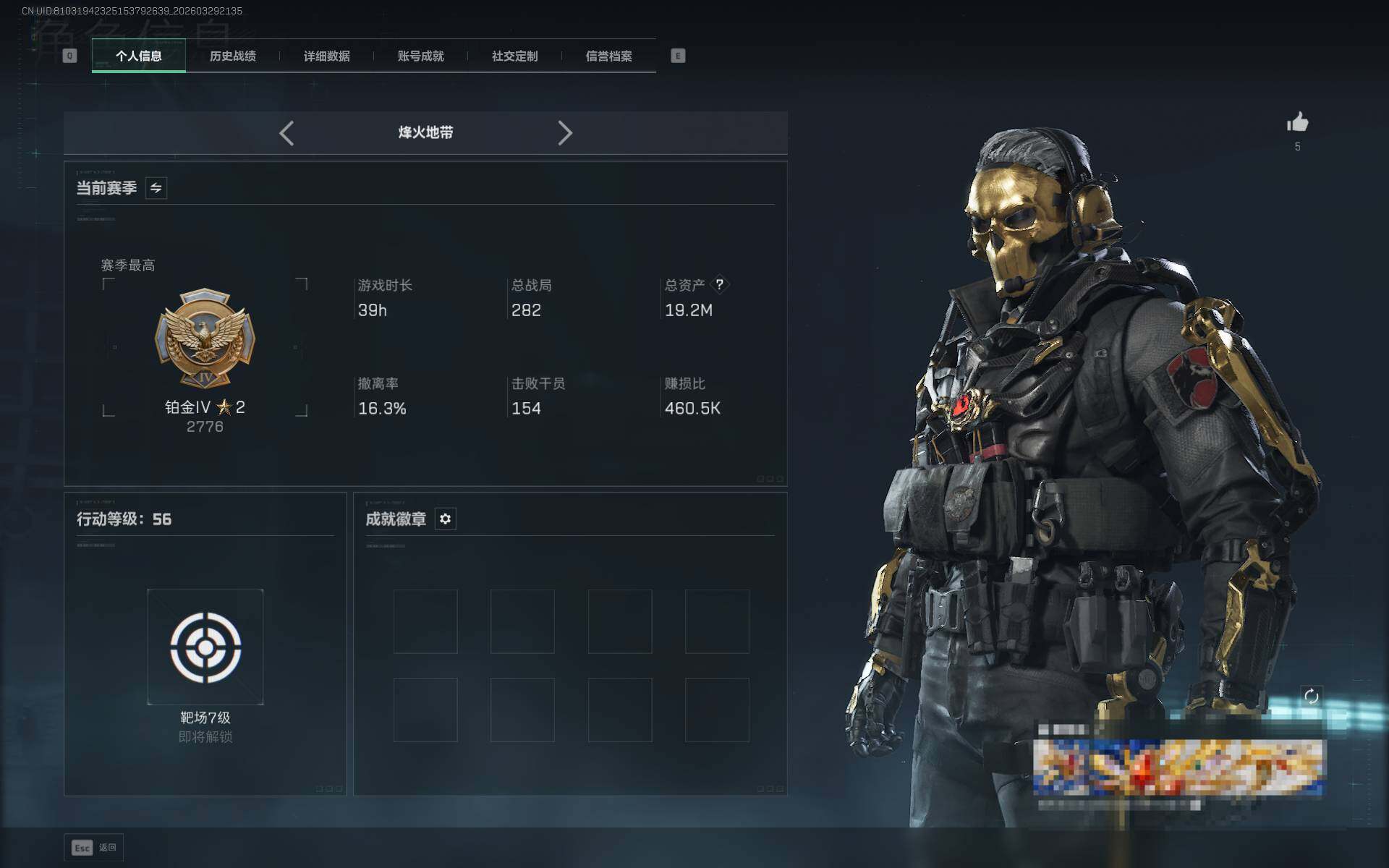 总资产(M):19M/哈夫币(K):14147K/传说枪皮数:9/全面战场等级:23_段位:尉官/烽火地带等级:56_段位:铂金/红狼-蚀金玫瑰/骇爪-维什戴尔/红狼-电锯惊魂/近战-黑鹰
