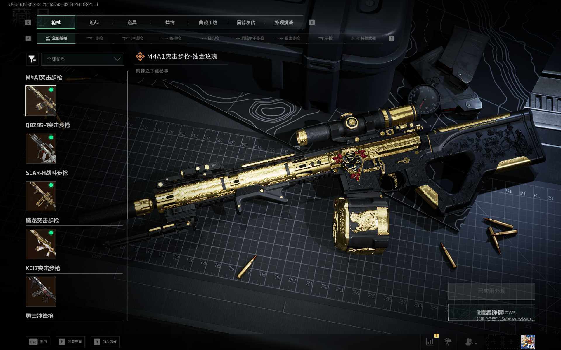 M4A1突击步枪-蚀金玫瑰/QBZ95-1突击步枪-凌霄戍卫/SCAR-H战斗步枪-启航/腾龙突击步枪-万金泪冠/KC17突击步枪-电锯惊魂/勇士冲锋枪-万金泪冠/M14射手步枪-缄花/R93狙击步枪-维什戴尔/AWM狙击步枪-万金泪冠/K416突击步枪-阿萨拉特攻/MP5冲锋枪-战术竞备/MP5冲锋枪-竞技风/SMG-45冲锋枪-阿萨拉特攻/勇士冲锋枪-工业狂潮/MP7冲锋枪-六套之力