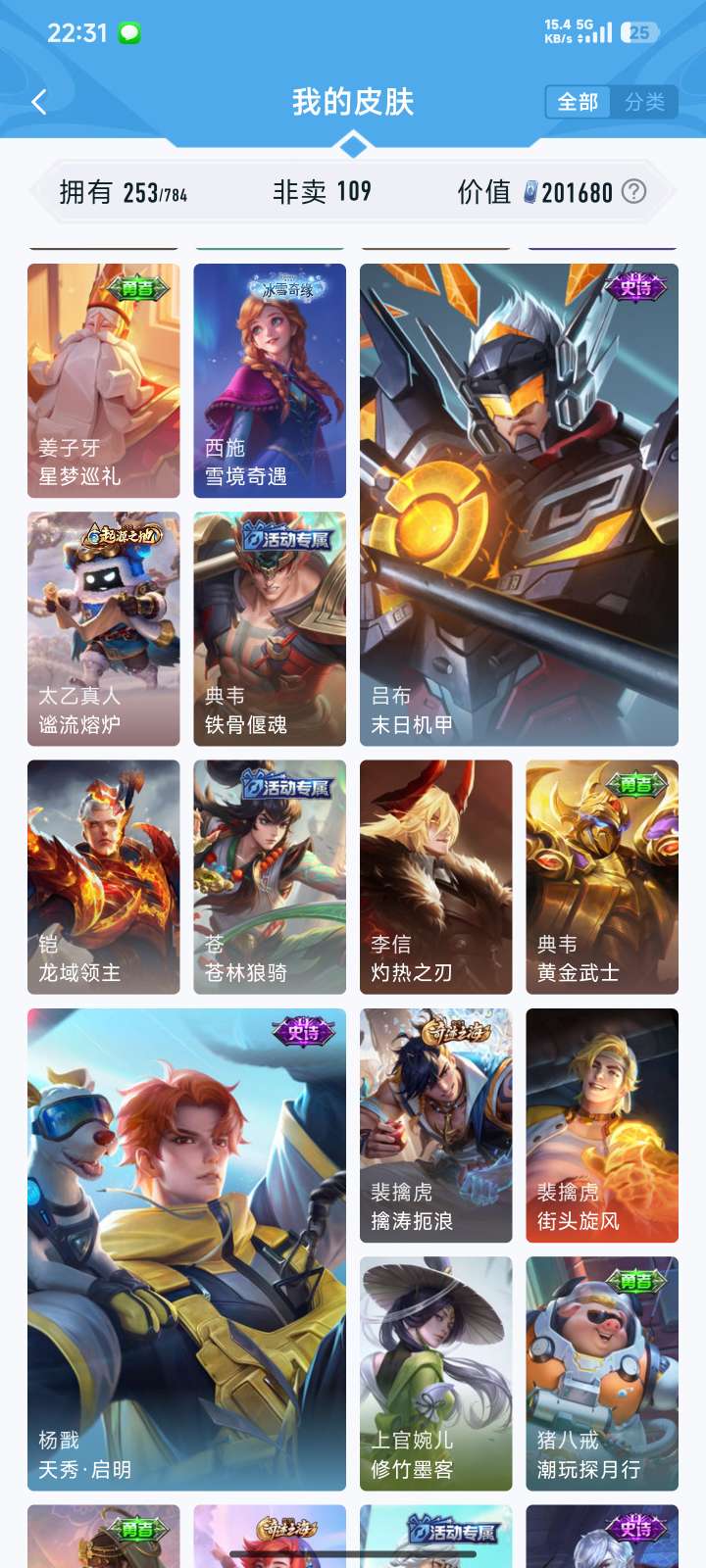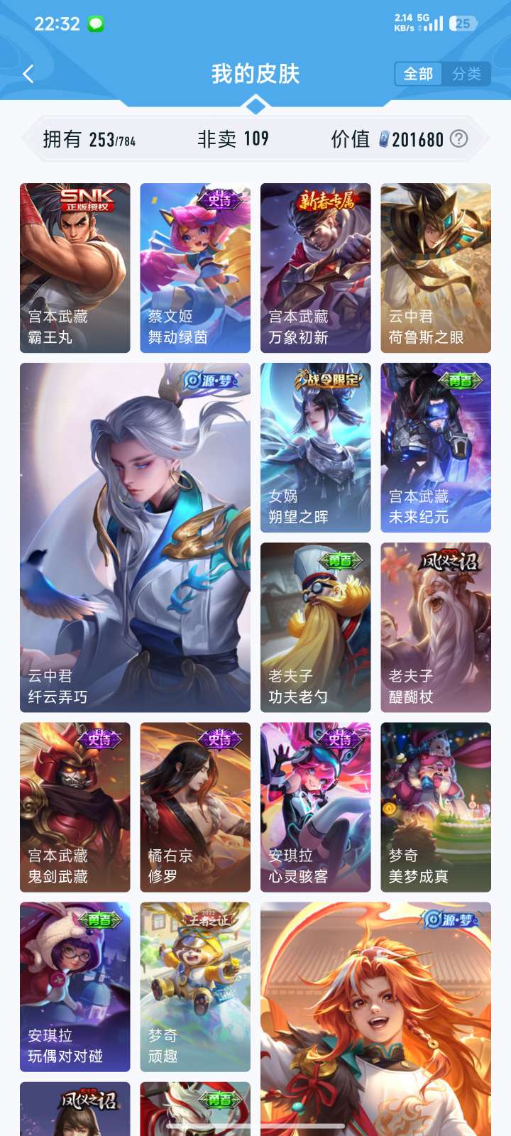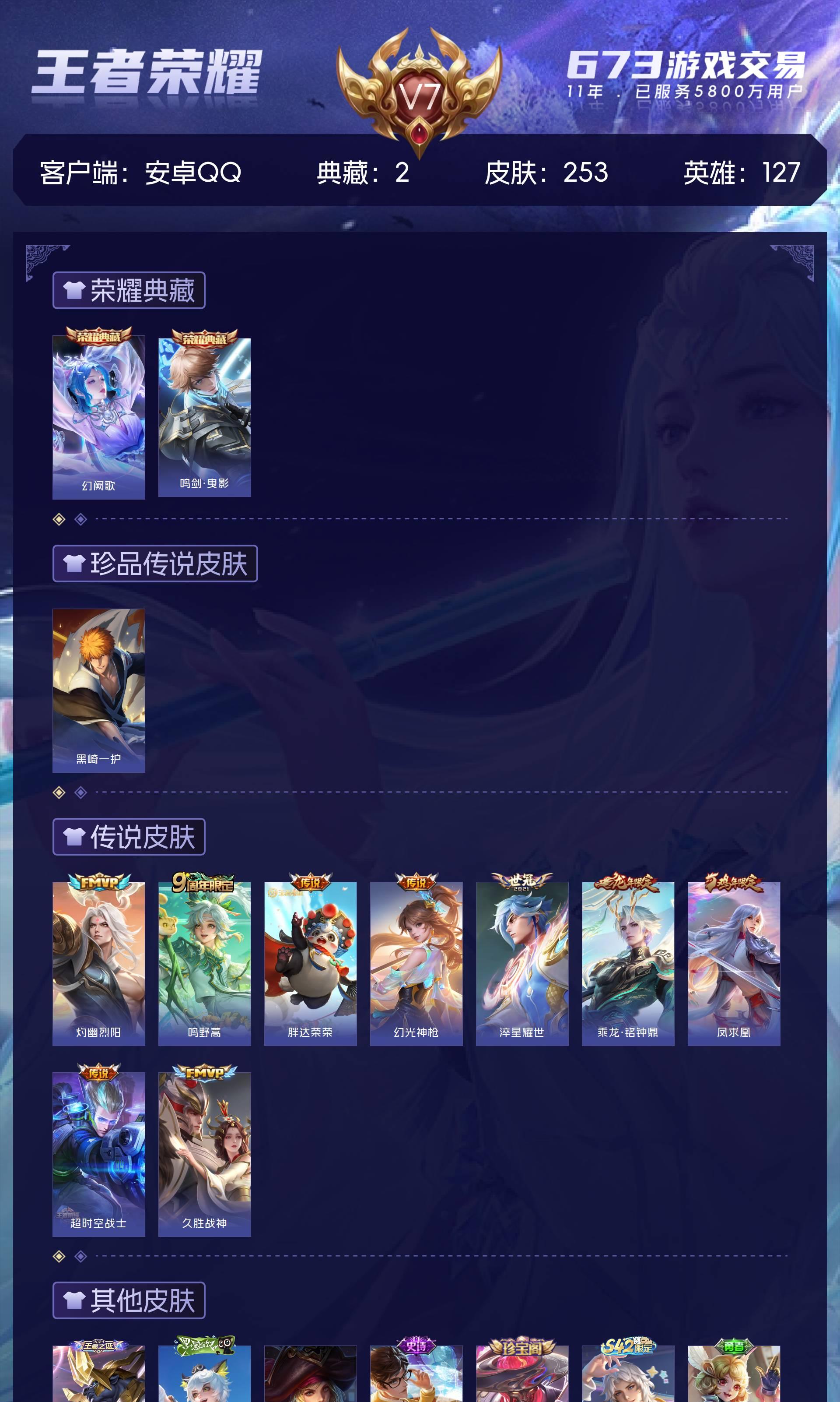 V7 皮肤253 英雄127 无双王者 荣耀典藏2 珍品传说1 星传说1 传说9