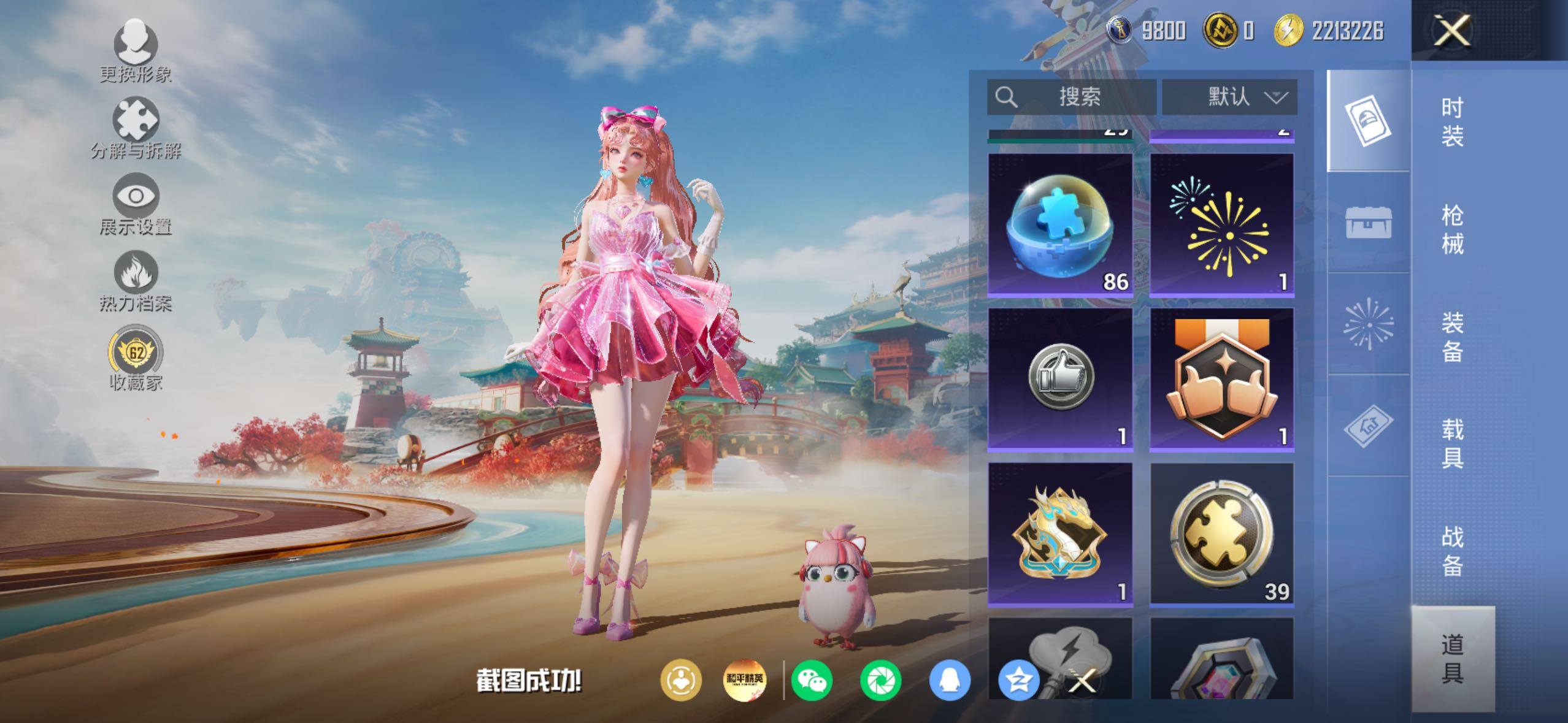 苹果 手Q-4粉装-5特效枪-0载具-3粉色飞行器-73003热力值-19王牌印记-169套装-225枪皮