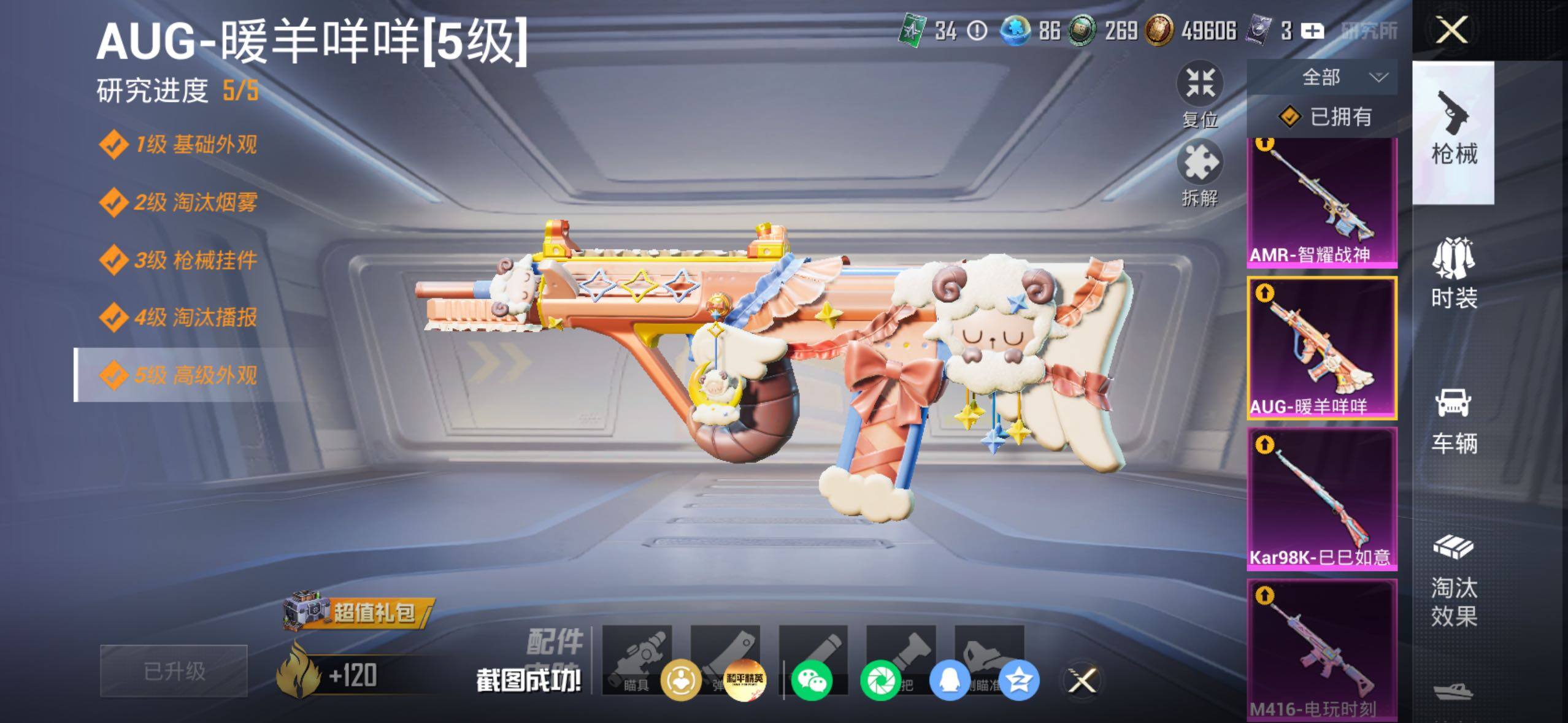 【粉色枪皮等级】:M416-电玩时刻(五级),AUG-暖羊咩咩(五级),Kar98K-巳巳如意(五级),AMR-智耀战神(六级),DP-28-豹影疾电