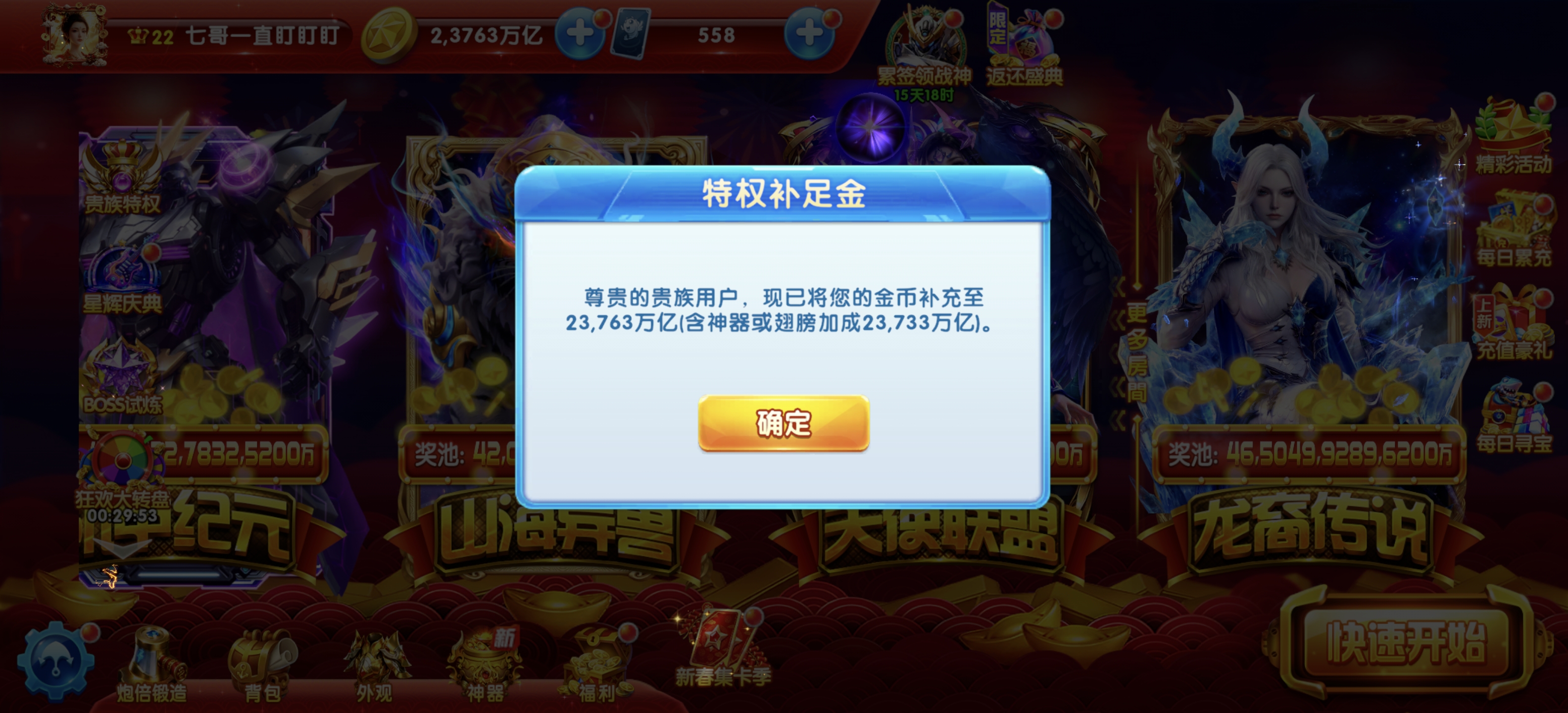 vivo版贵族22,13套-绝版星甲,带三个v8小号 神器599,师徒99,机甲999,其它都在图里,加成1540,新战神全3,包里还有圣器突破装置,材料碎片多多,换绑一切,完美养老,新活动才氪了4000多