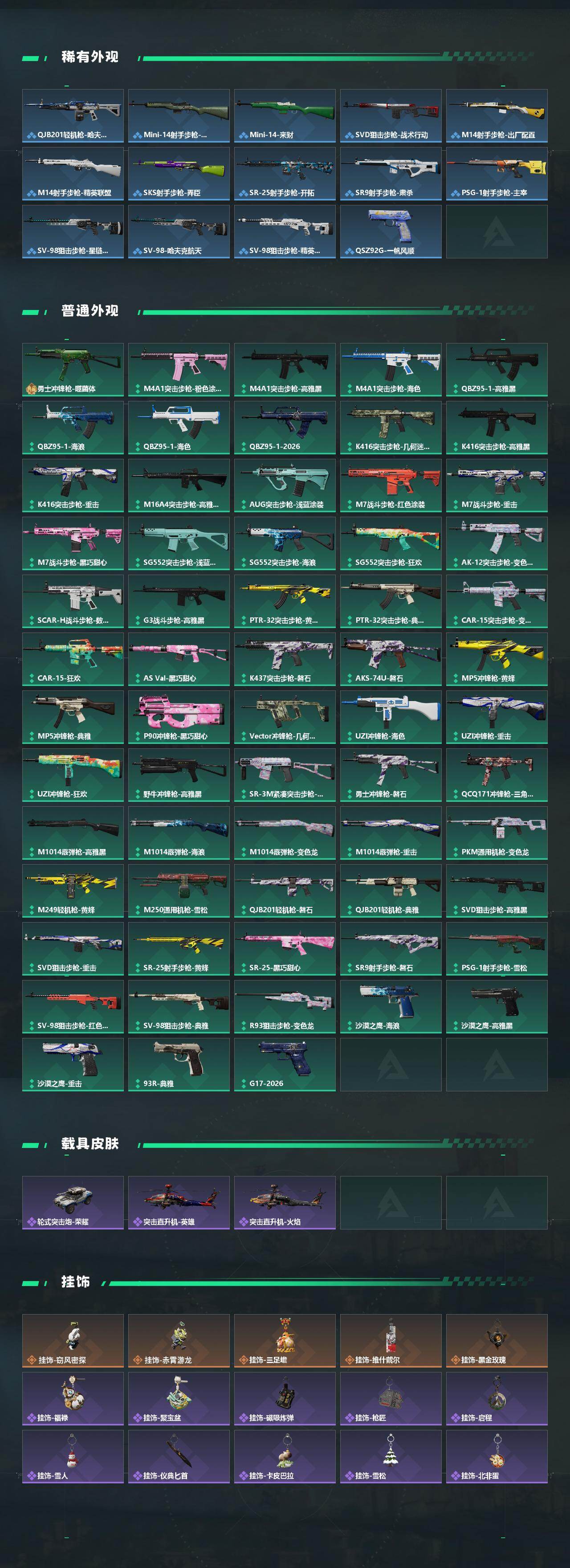 【传说外观】:K416突击步枪-行动记录,SG552突击步枪-运动员,SG552突击步枪-点翠,SCAR-H战斗步枪-启航,SCAR-H战斗步枪-荼蘼,腾龙突击步枪-万金泪冠,KC17突击步枪-点翠,SR-3M紧凑突击步枪-荼蘼,勇士