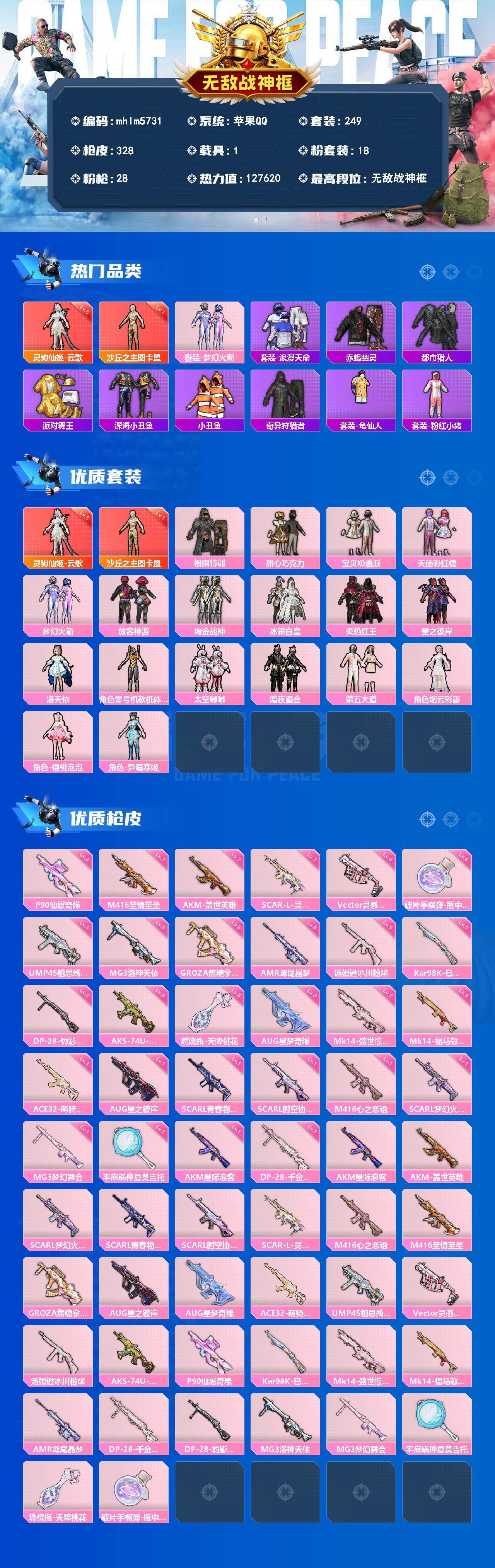【mhlm5731】苹果 手Q-无敌战神框-2神装-18粉装-28特效枪-1载具-9粉色飞行器-127620热力值-20王牌印记-249套装-328枪皮