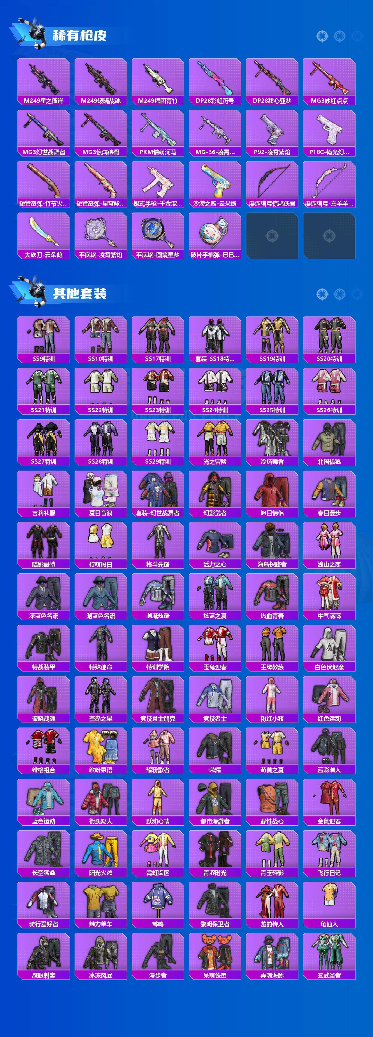 【粉色套装】:粉装-天使彩虹糖,粉装-齐天大圣,粉装-瑰丽时代,套装-创世·救赎,角色-冷漠罗丽,角色-羊梦糖心,角色-虎痴许褚