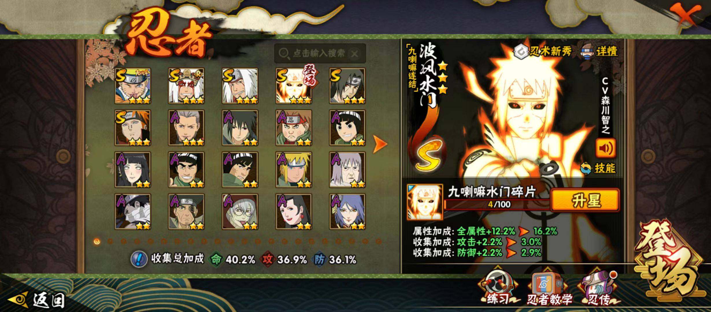 【A级忍者】:波风水门「青年」(2星),迪达拉「晓创生」(2星),飞段(3星),飞段「死司凭血」(2星),干柿鬼鲛(2星),迈特凯(2星),桃地再不斩「秽土转生」(2星),