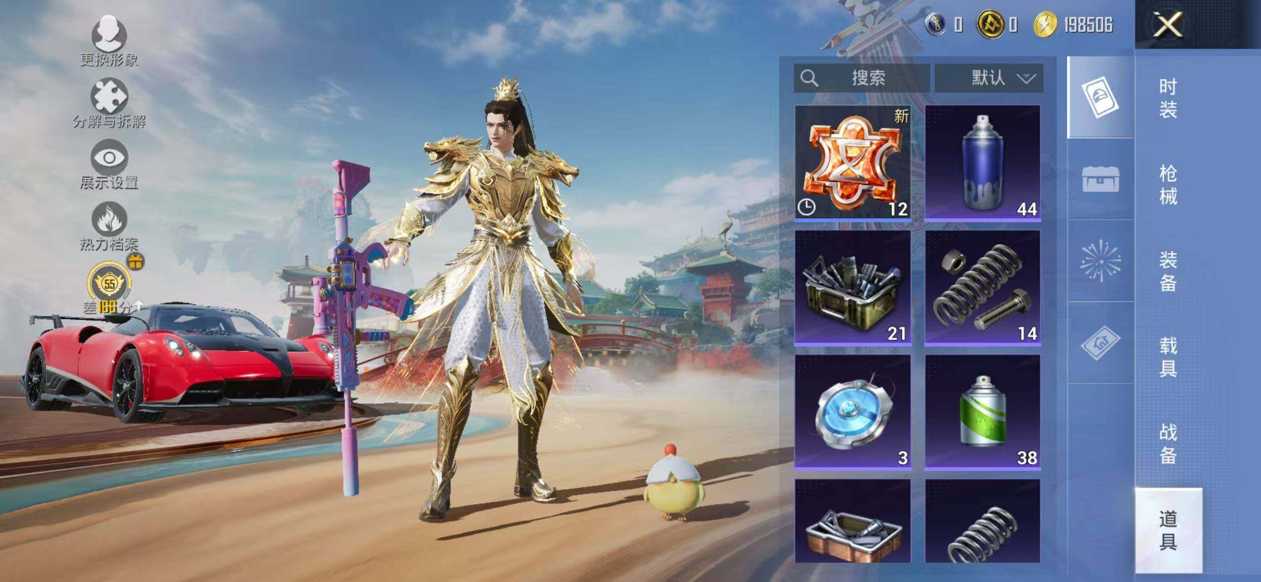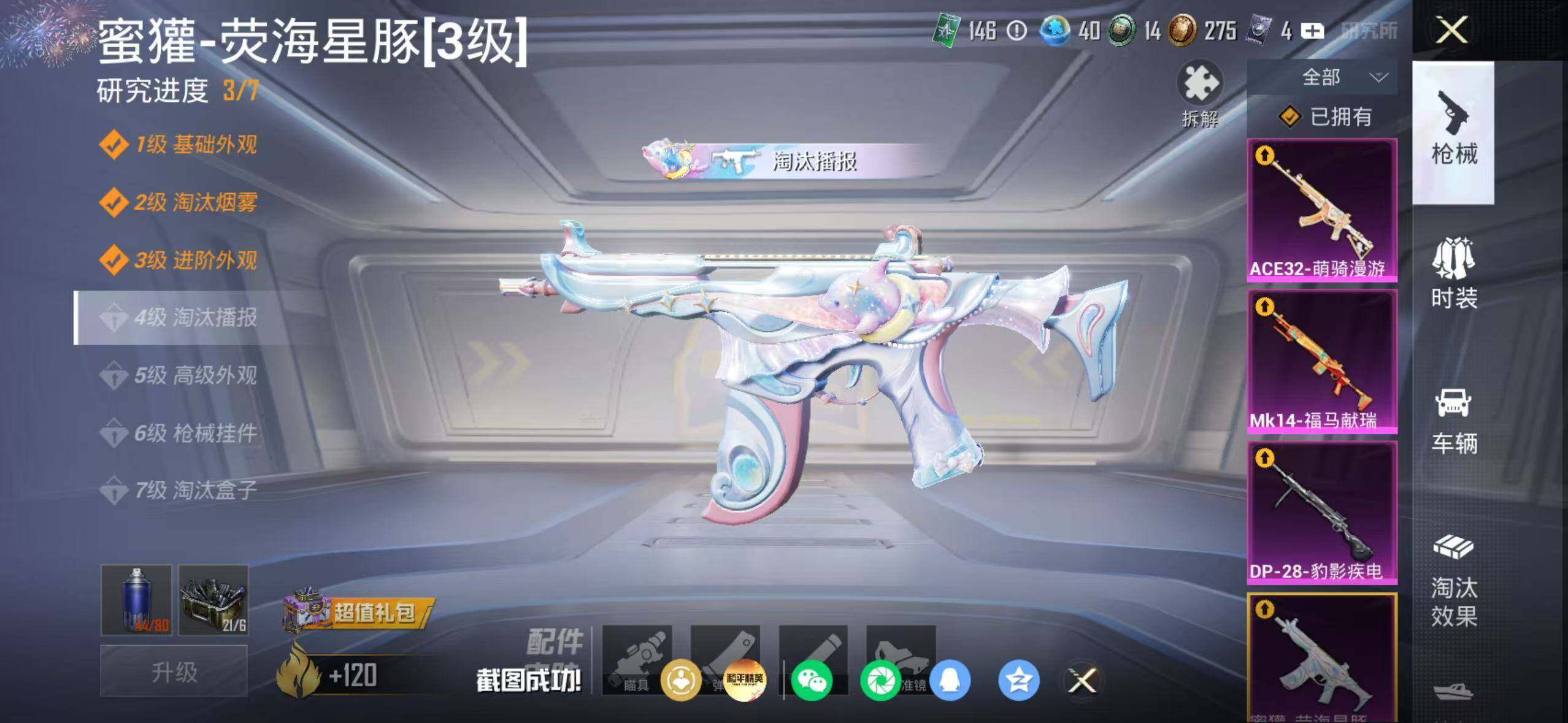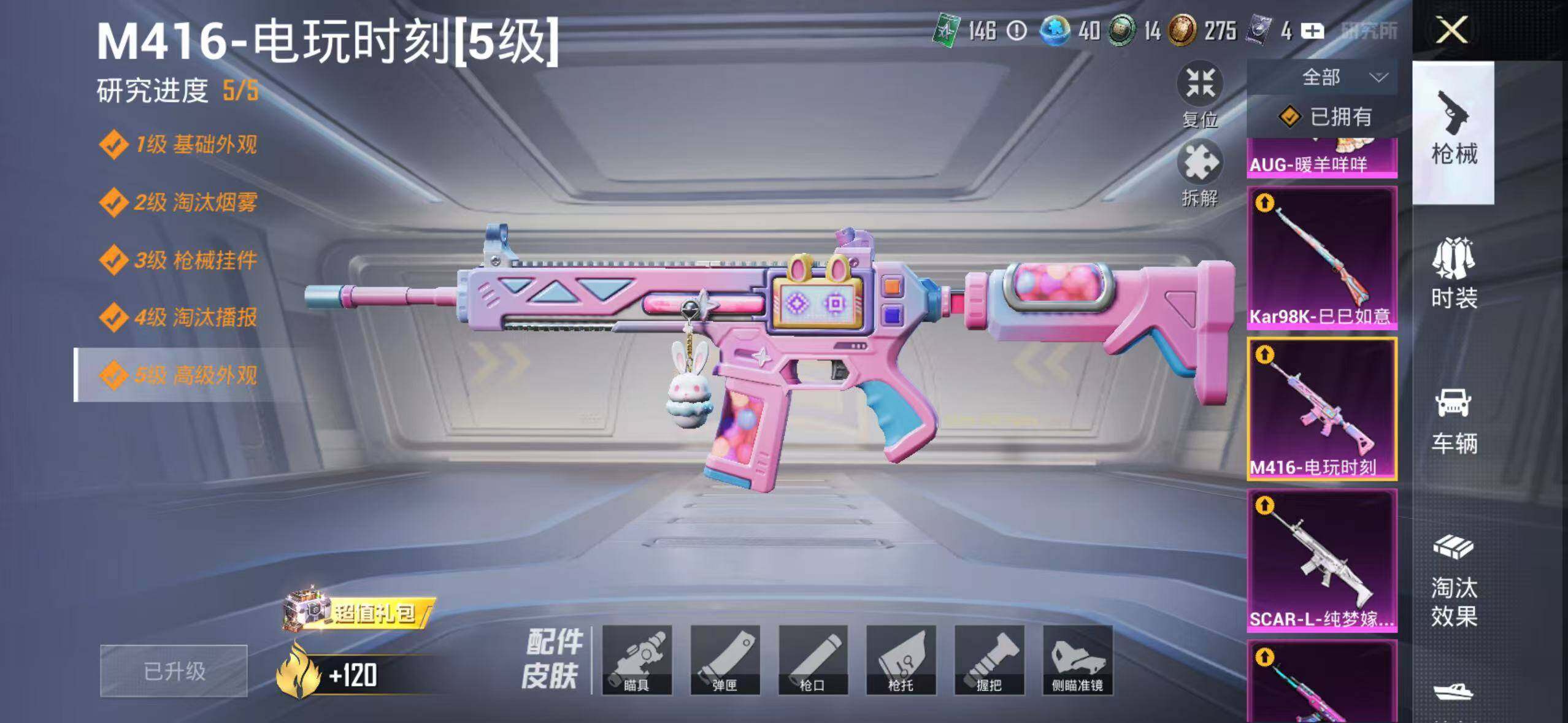 苹果 手Q-1神装-6粉装-9特效枪-1载具-1粉色飞行器-44560热力值-7王牌印记-88套装-140枪皮