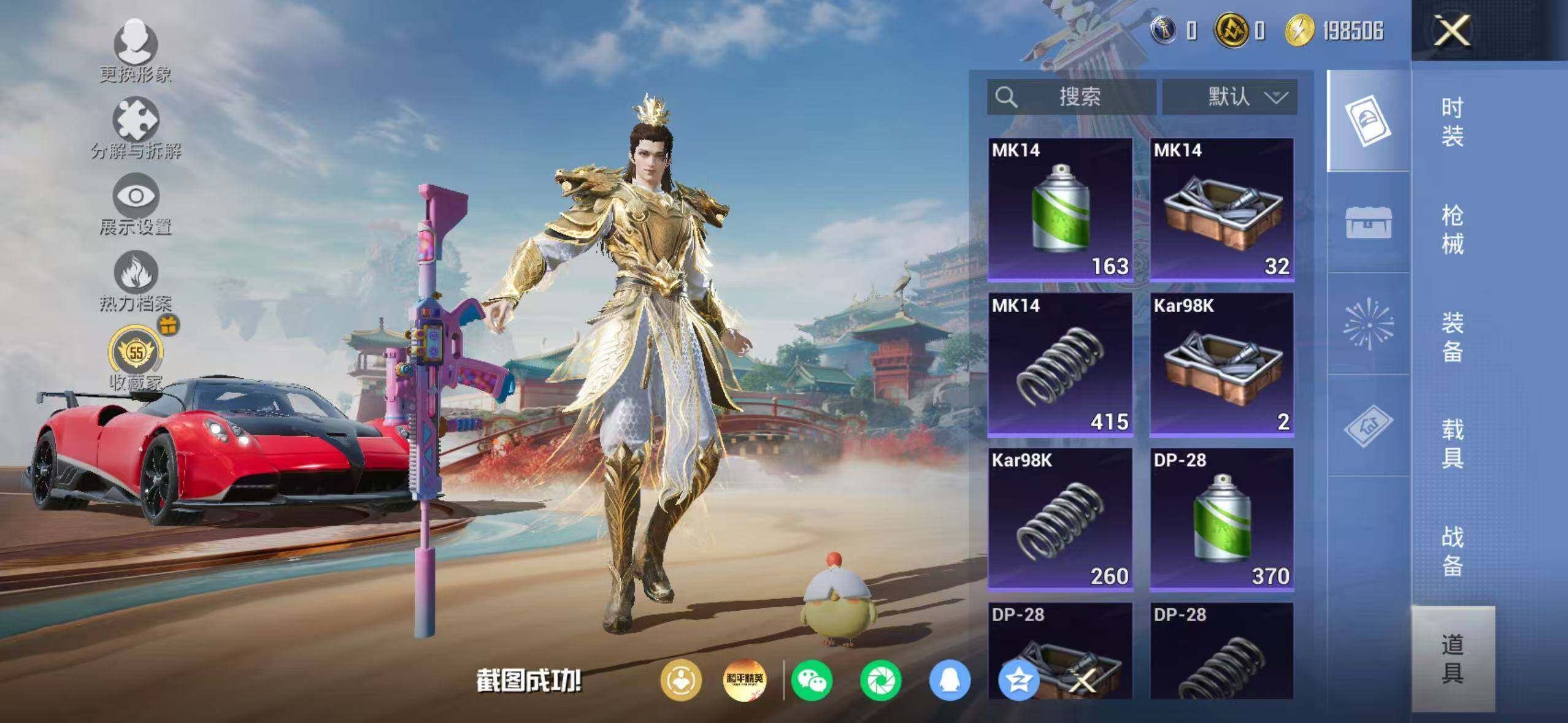 苹果 手Q-1神装-6粉装-9特效枪-1载具-1粉色飞行器-44560热力值-