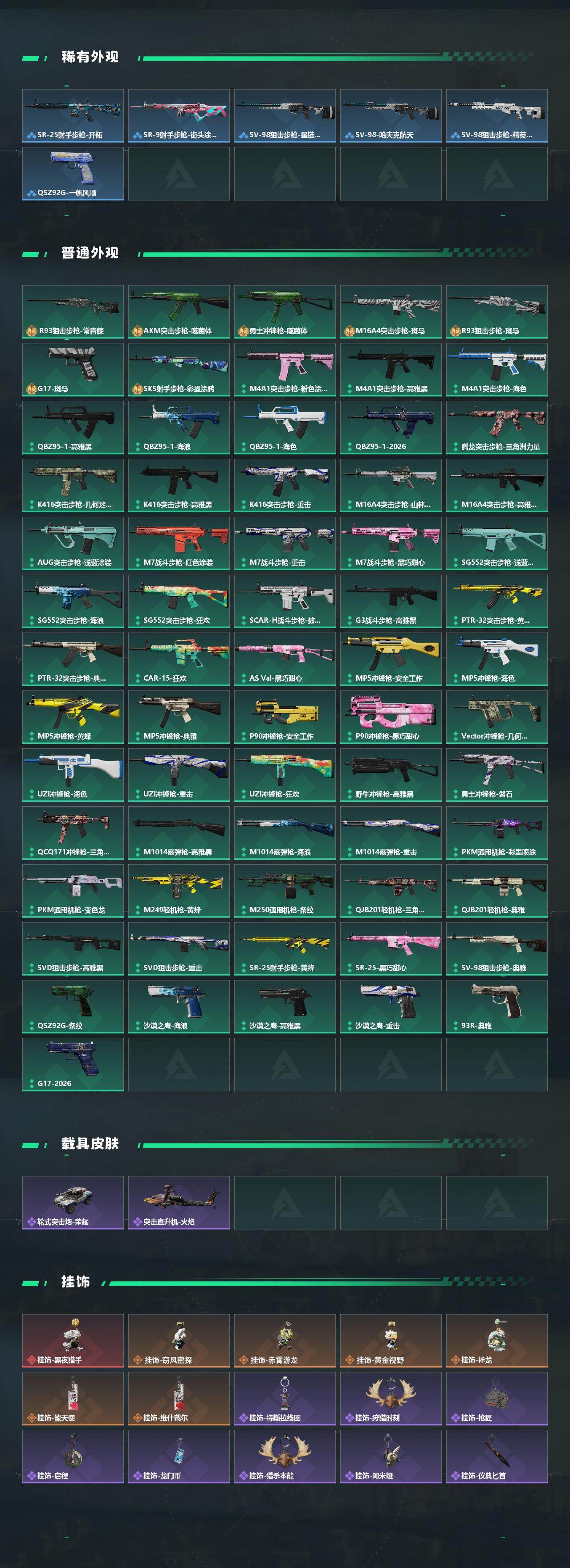 【传说外观】:M4A1突击步枪-阿米娅,AKM突击步枪-锦绣,K416突击步枪-行动记录,M16A4突击步枪-狩猎时刻,AK-12突击步枪-特斯拉线圈,SCAR-H战斗步枪-启航,G3战斗步枪-狩猎时刻,G3战斗步枪-骑士,CAR-15突击步枪-阿米娅,腾龙突击步枪-