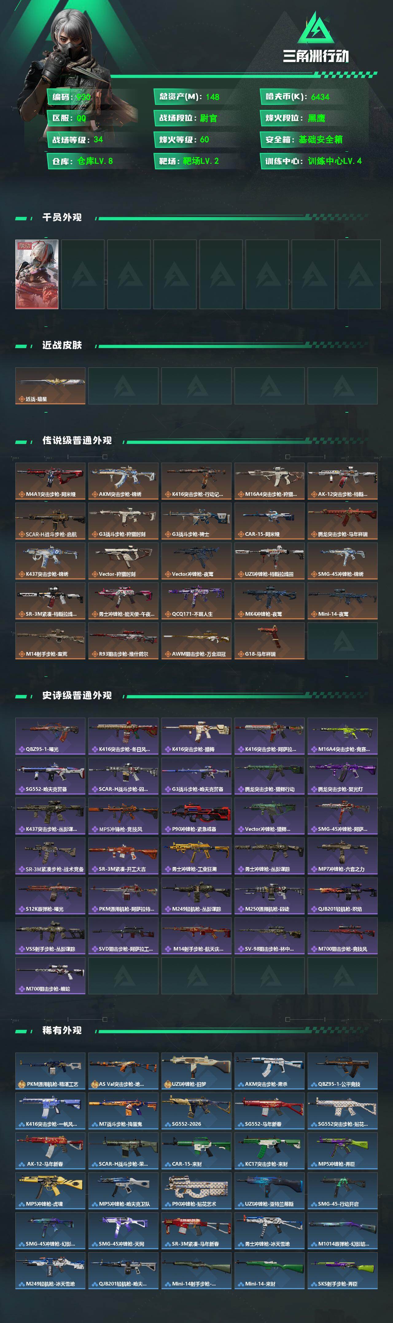 148m总资产-6434k哈夫币-60烽火等级-黑鹰-34战场等级-尉官【干