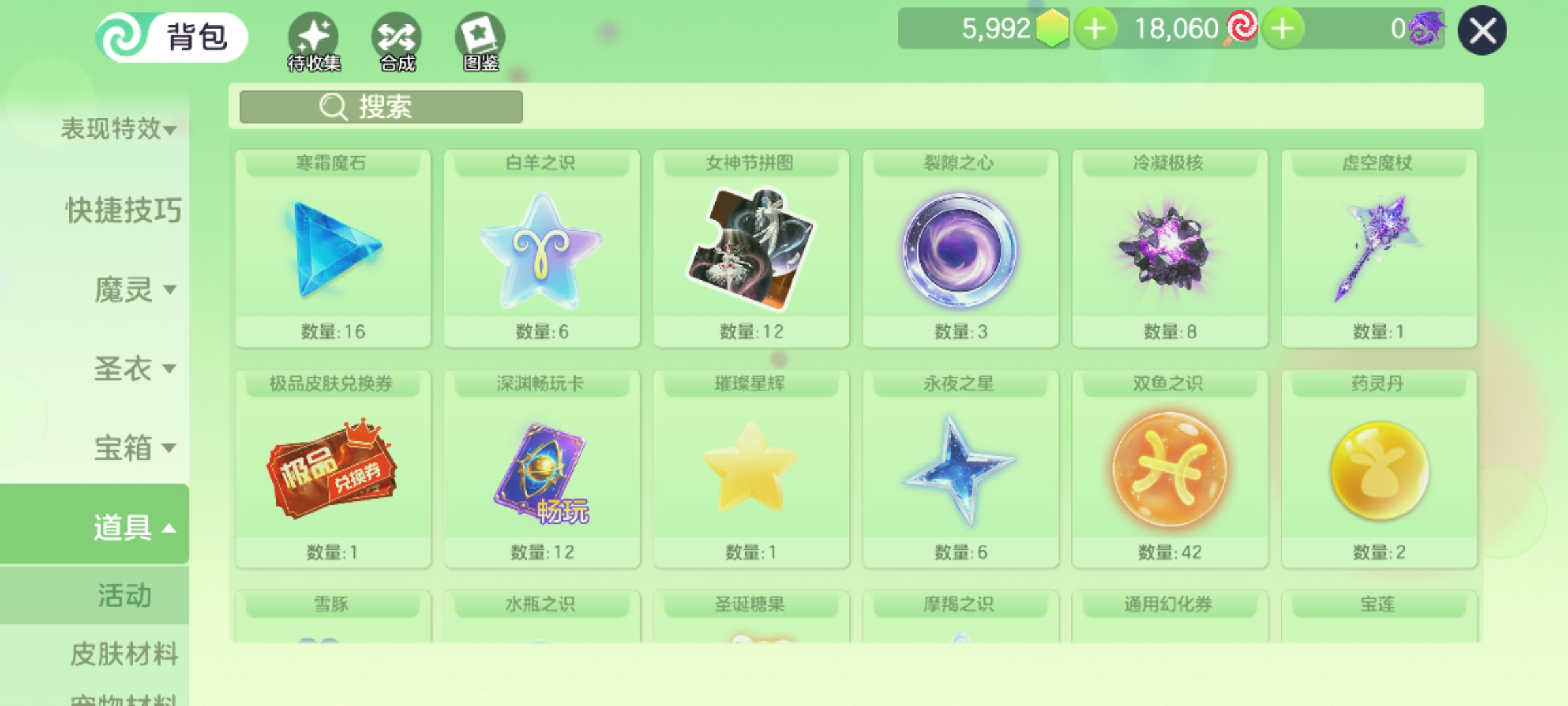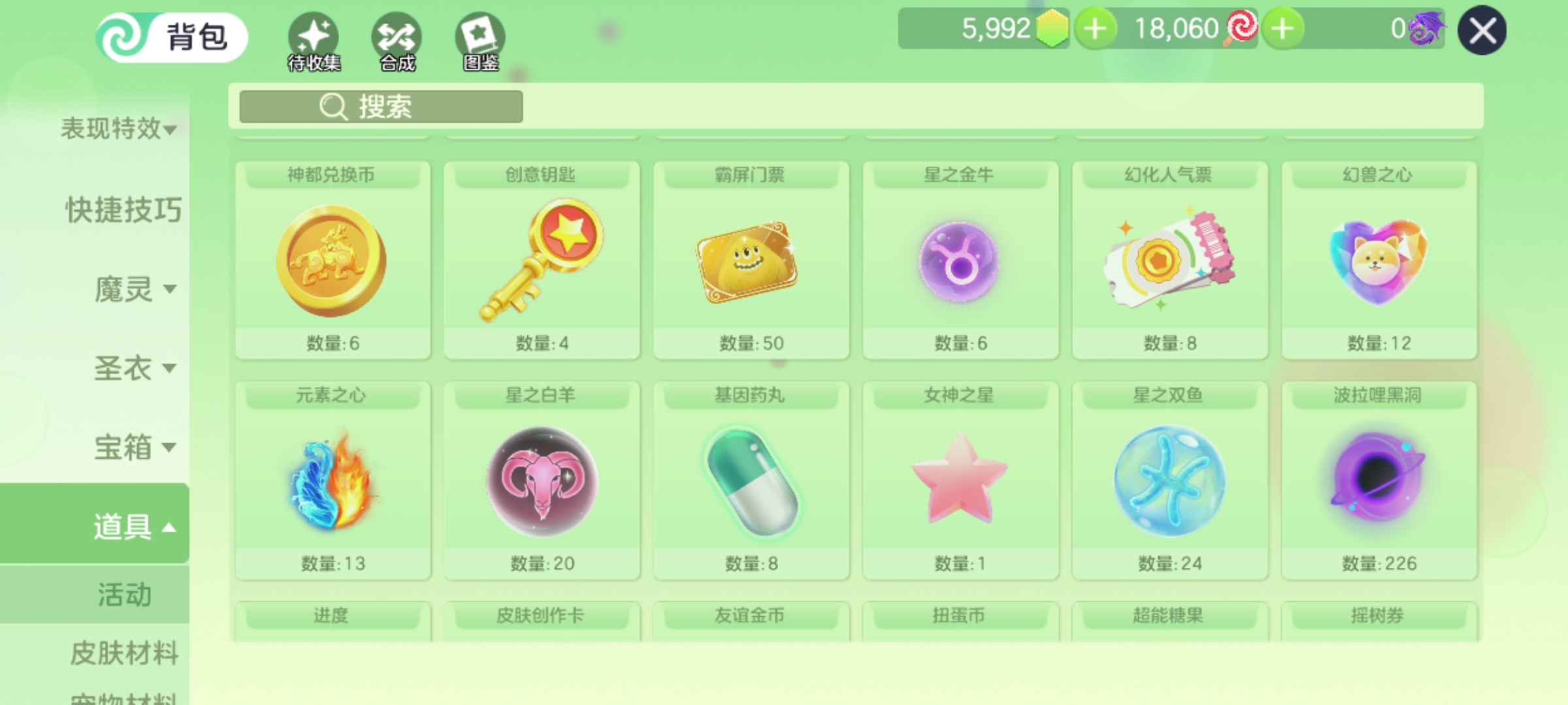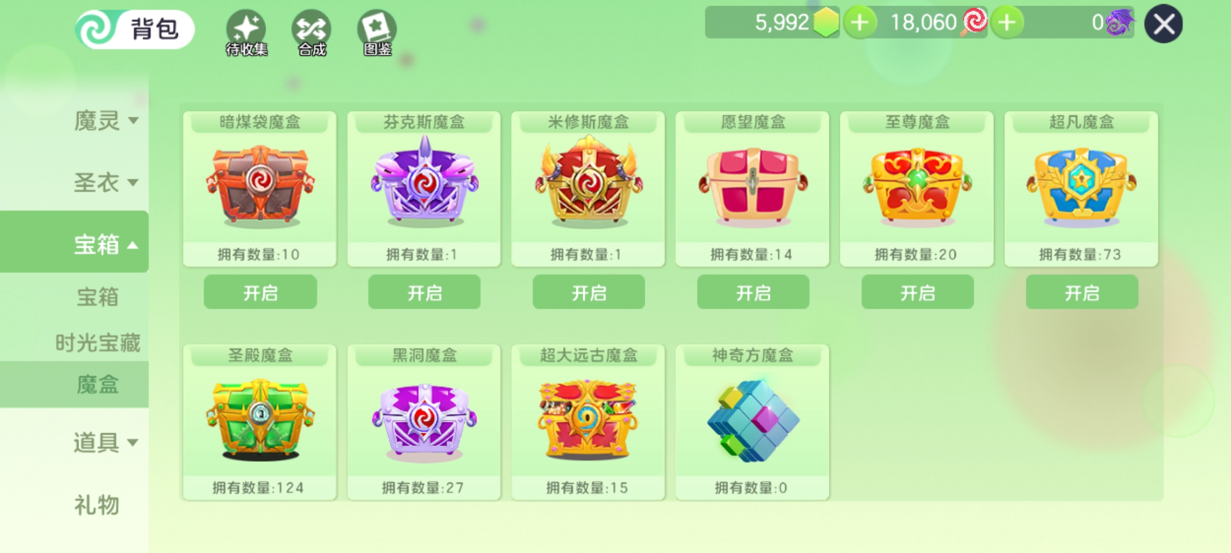 魔盒两百多,生存票135,黑洞密藏226,9个圣衣,皮肤十万多,很多礼物,乱七八糟的还有很多,自己看