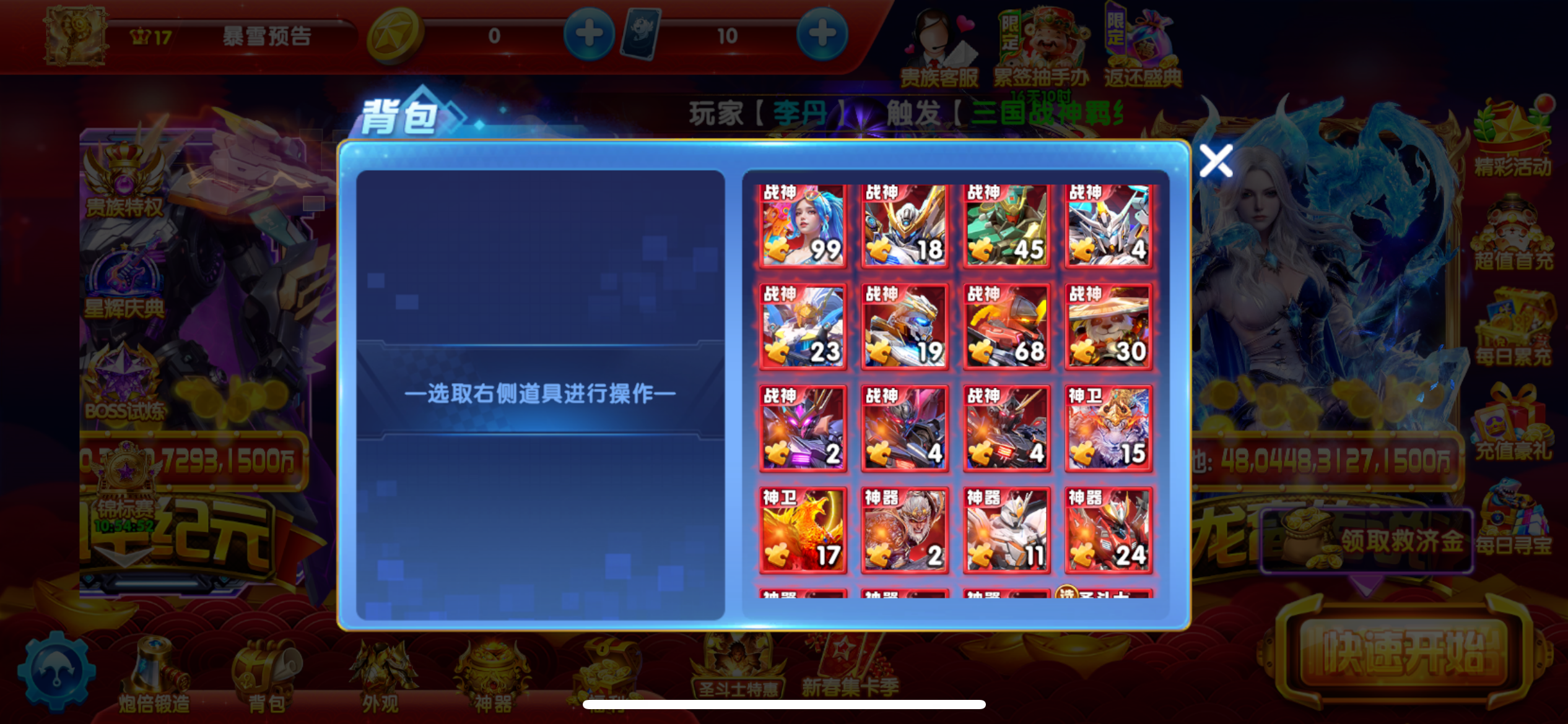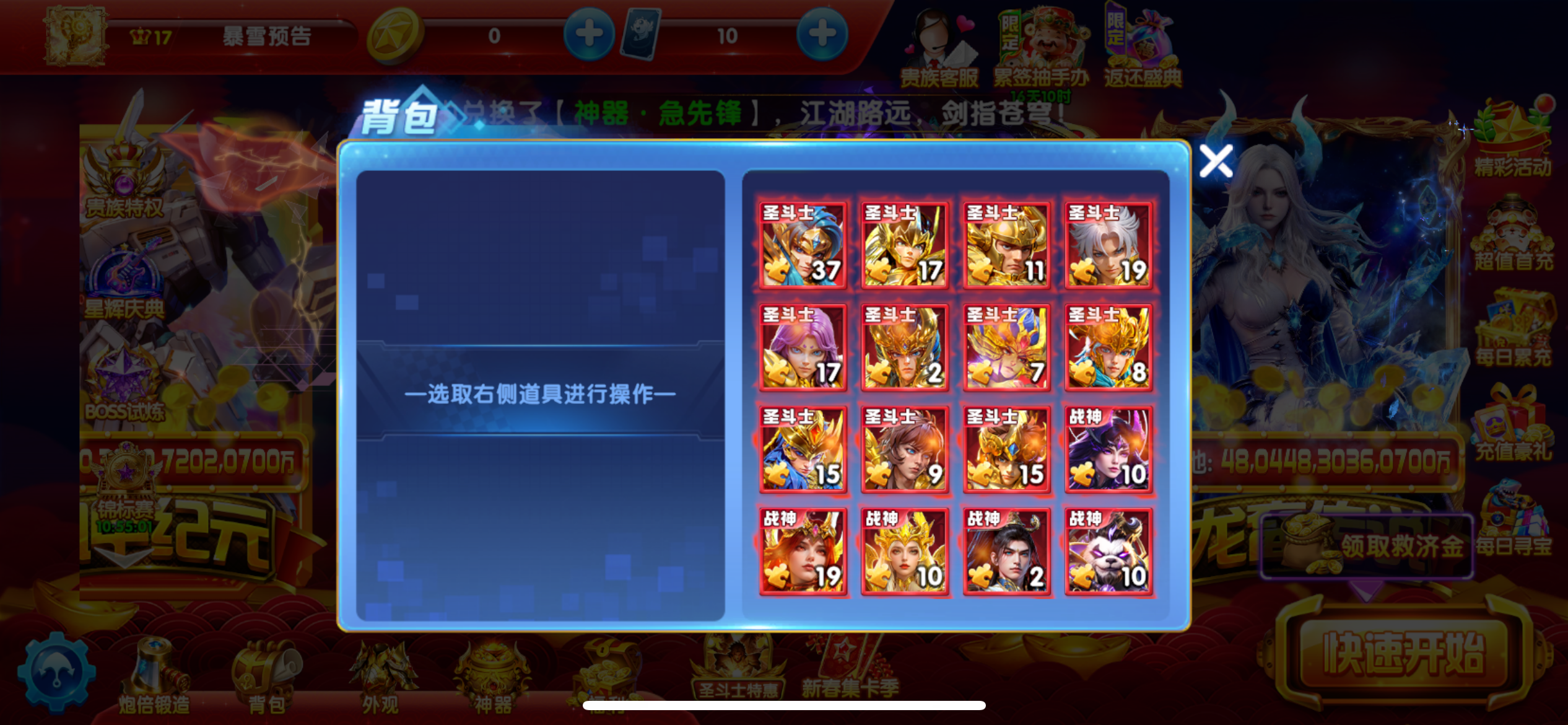 差几千v18,双神卫,魅魔冥斗士都有,背包碎片还有很多,圣器突破材料还有4个,差一点碎片就12套,