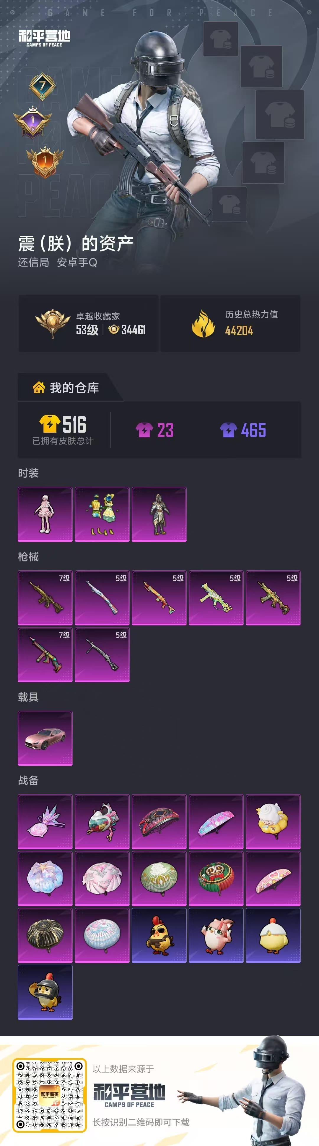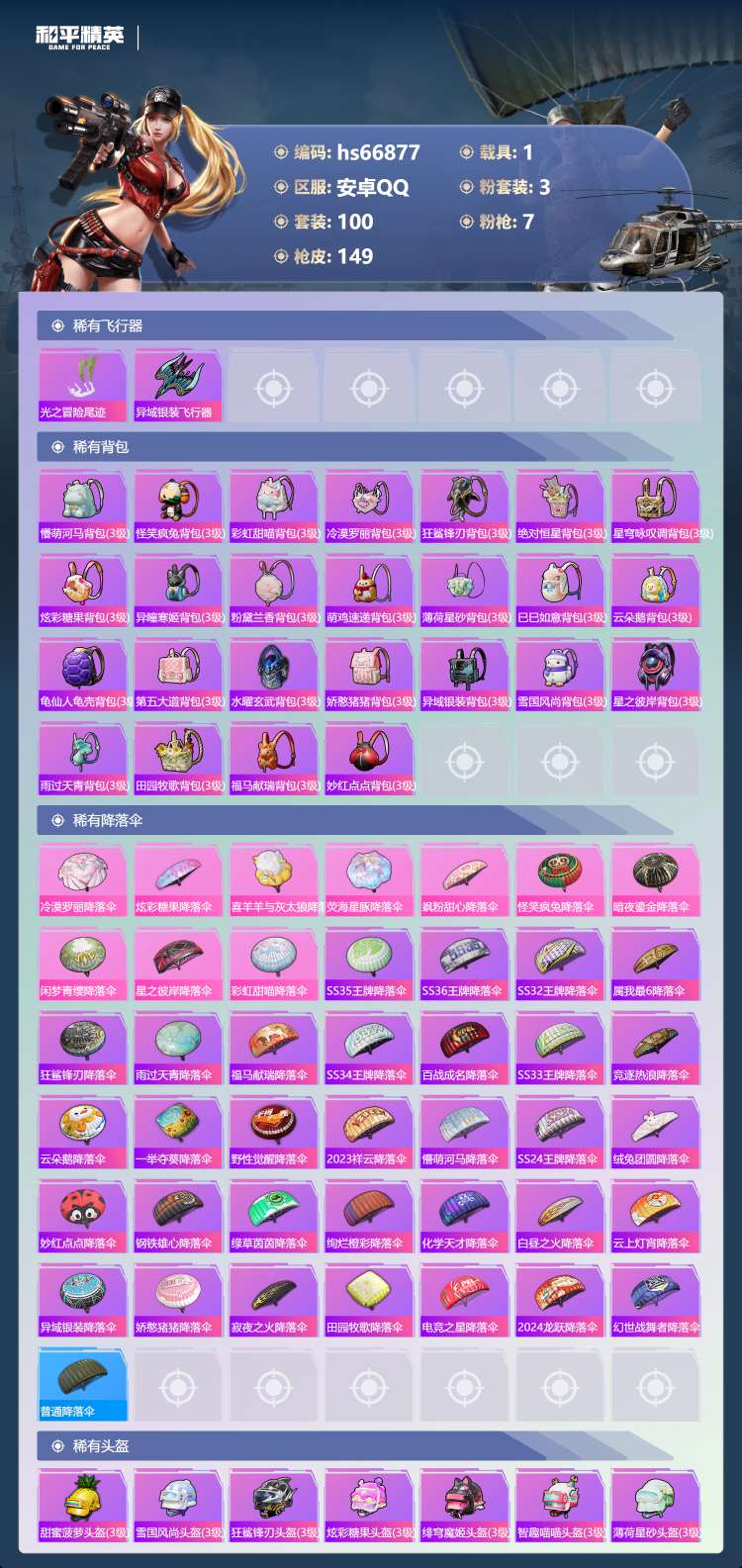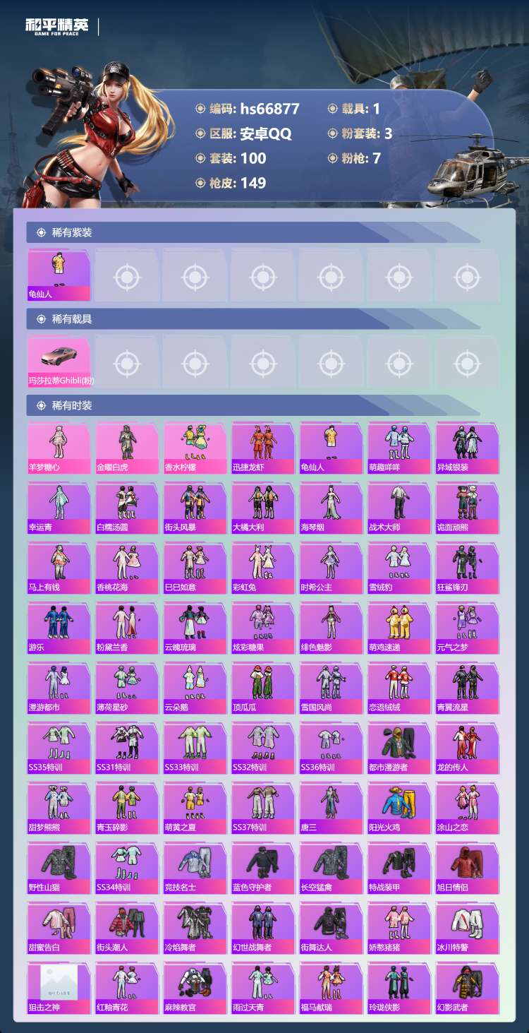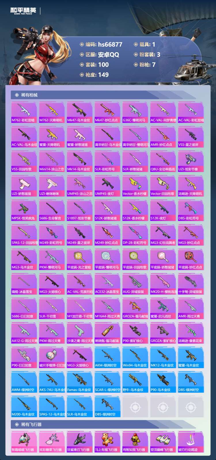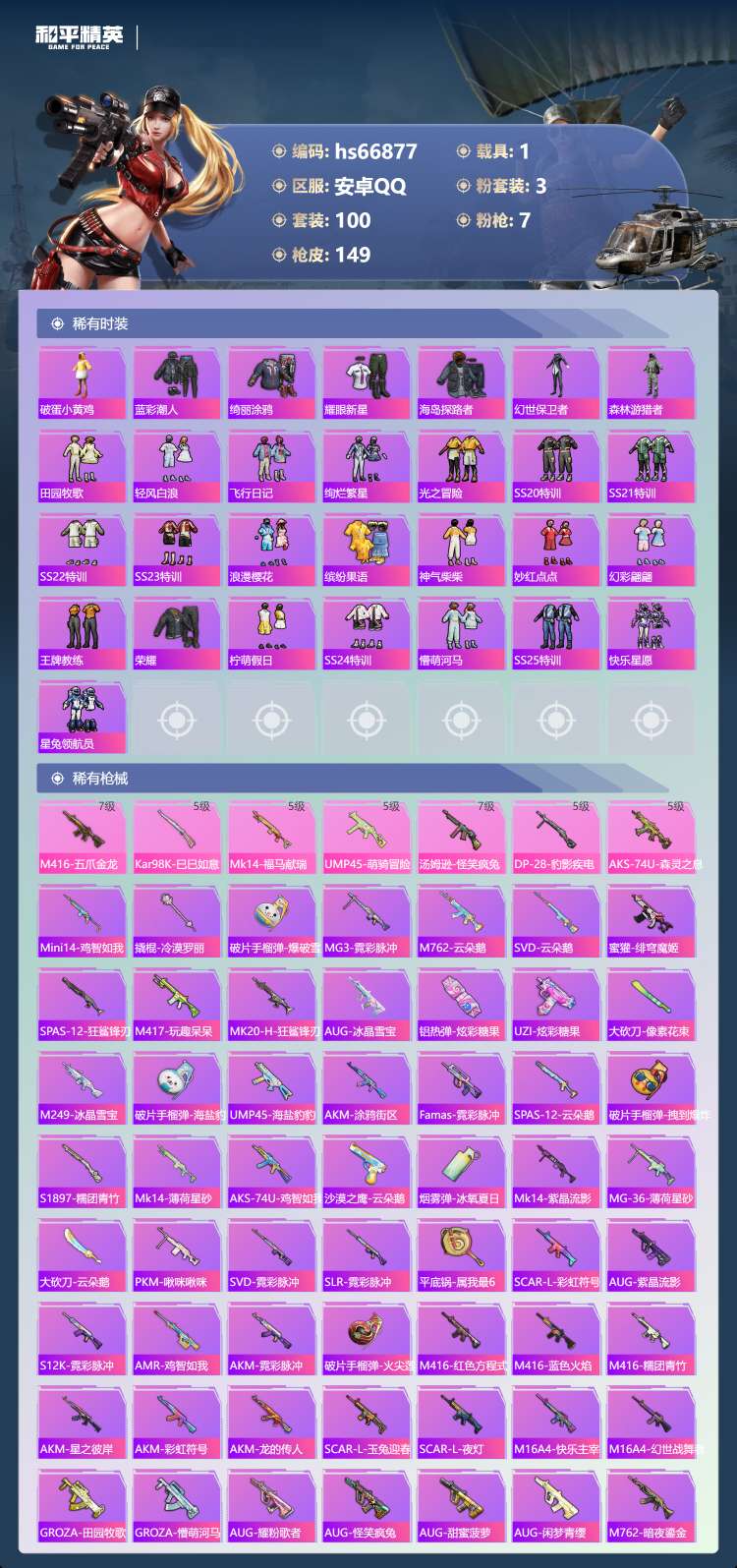 hs66877 安卓手Q-7王牌印记-3粉装-7特效枪-1载具-44204热力值-100套装-149