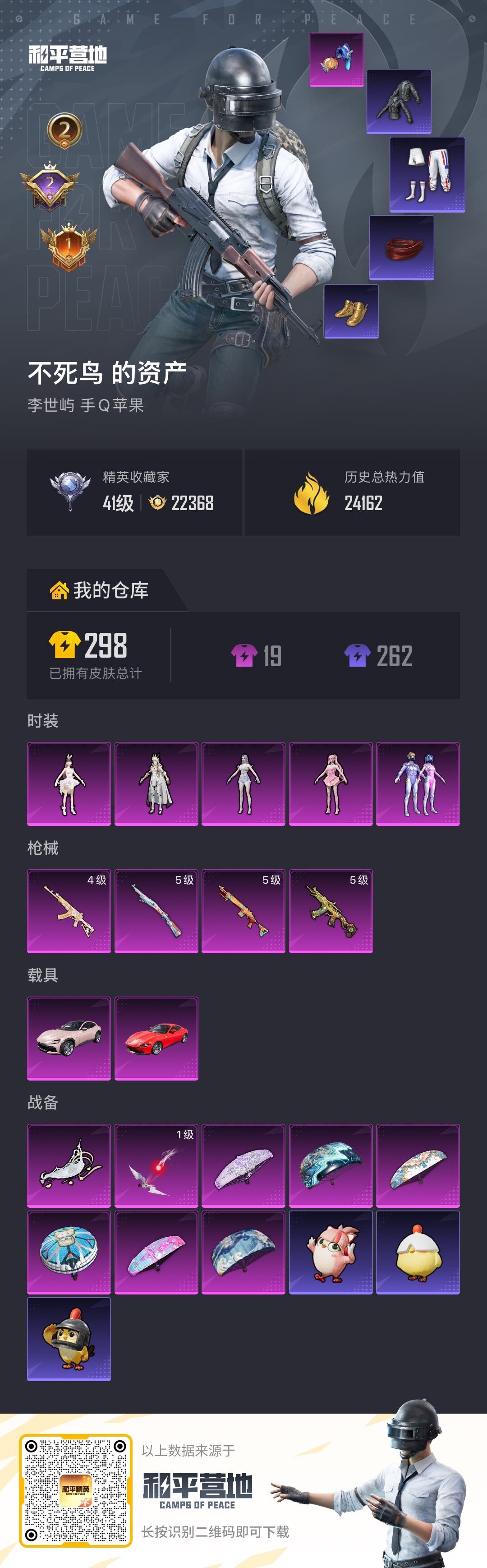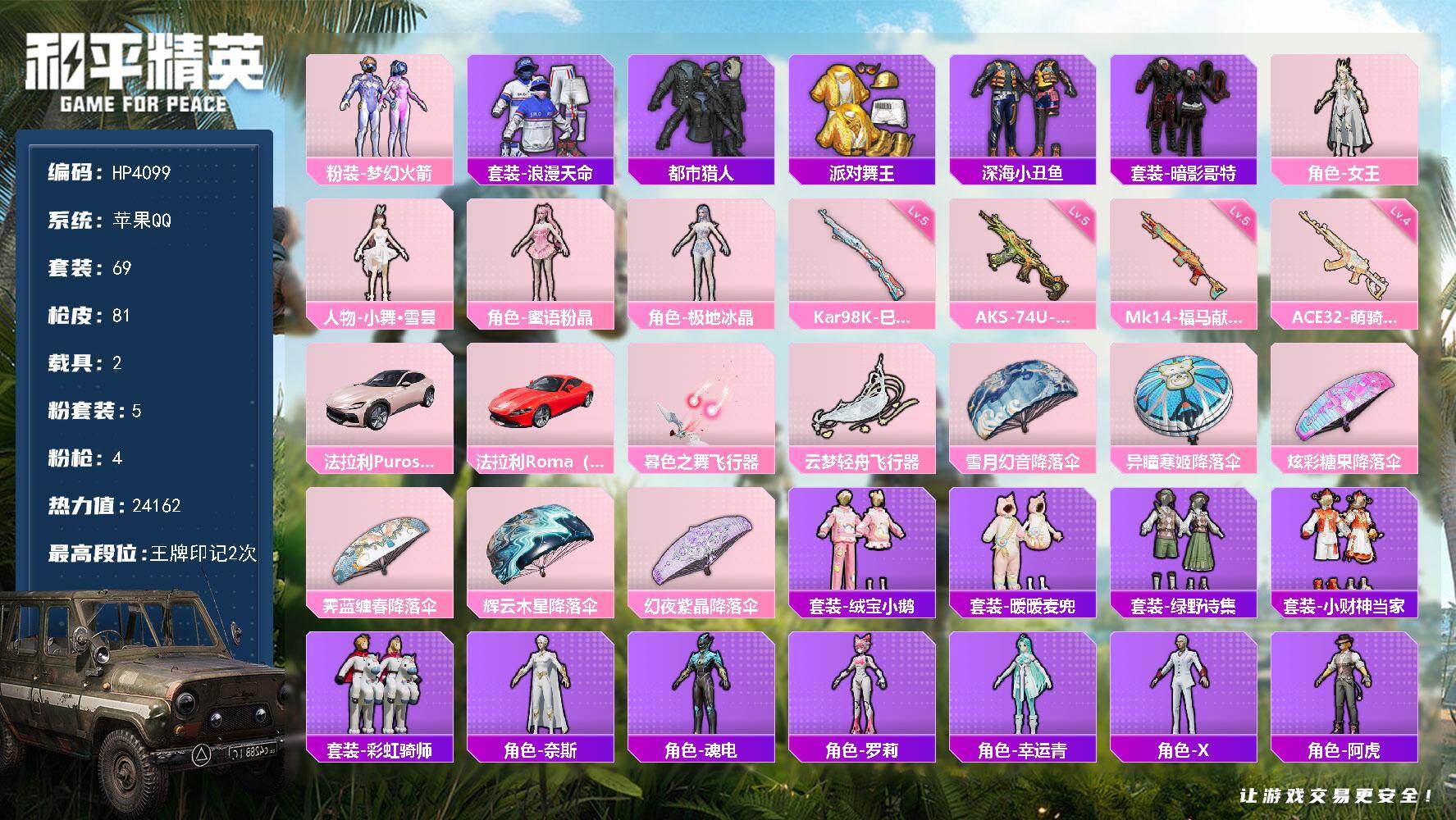苹果 手Q-5粉装-4特效枪-2载具-2粉色飞行器-24162热力值-2王牌印记-69套装-81枪皮