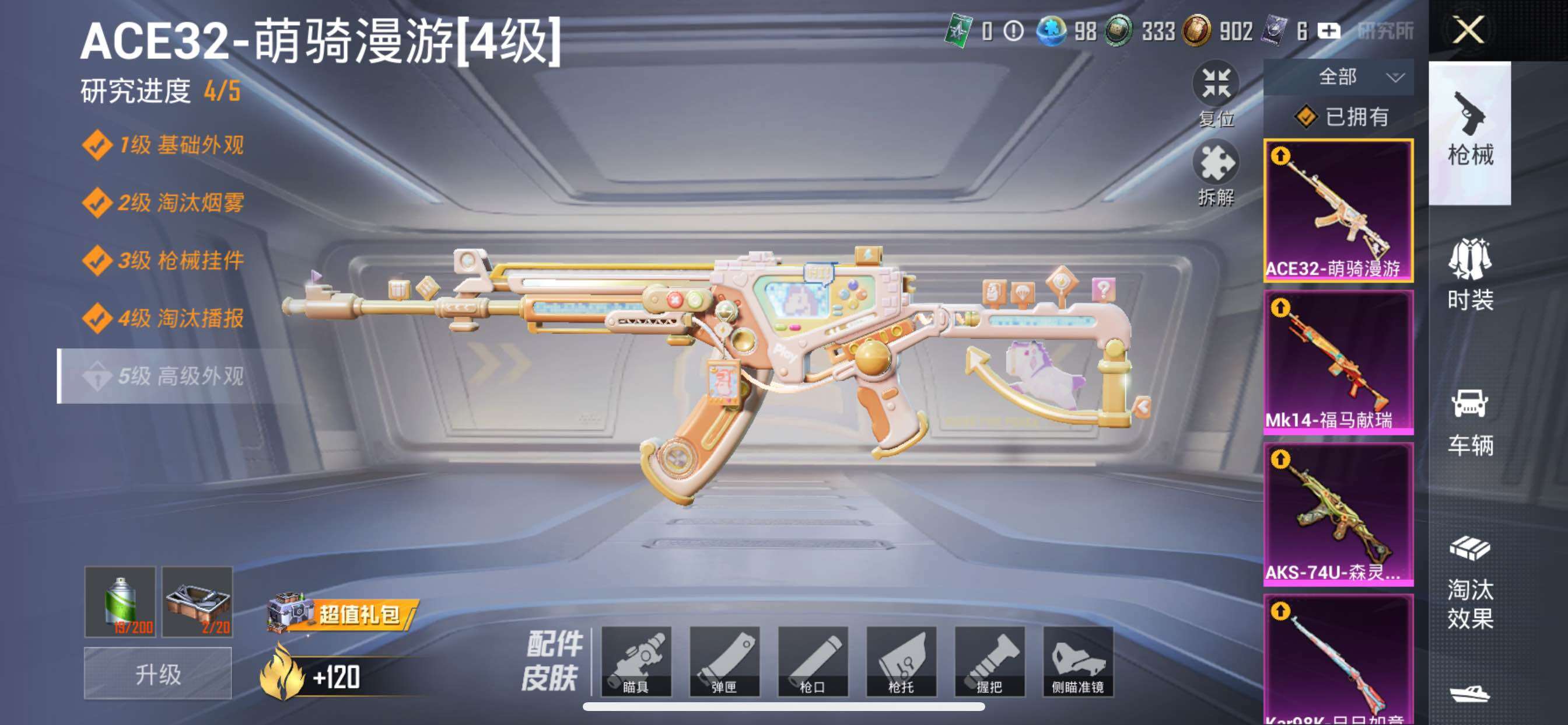 【粉色枪皮等级】:ACE32-萌骑漫游(四级),AKS-74U-森灵之息(五级),Kar98
