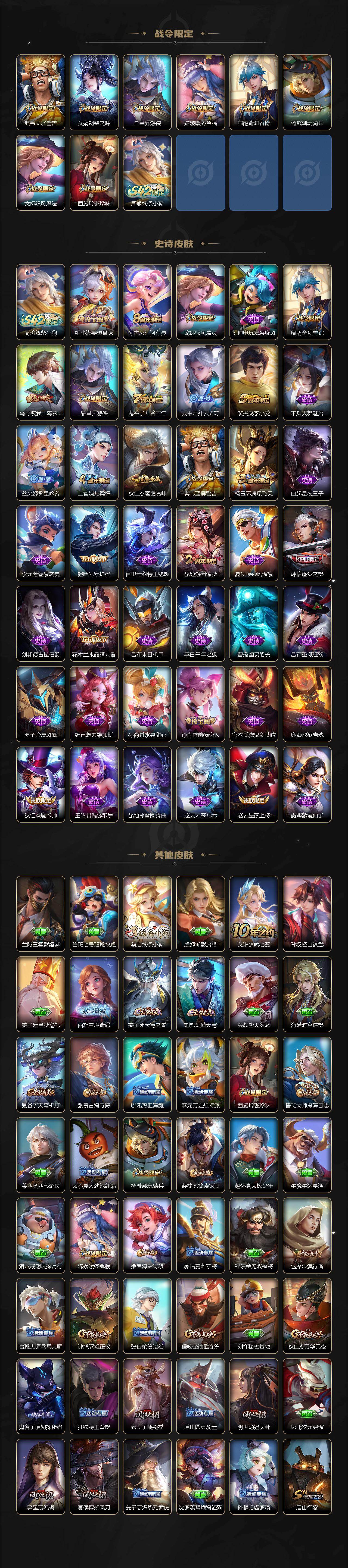 【限定皮肤】:白起狰,姜子牙天穹之誓,狄仁杰阴阳师,赵云皇家上将,孙尚香蔷薇恋人,