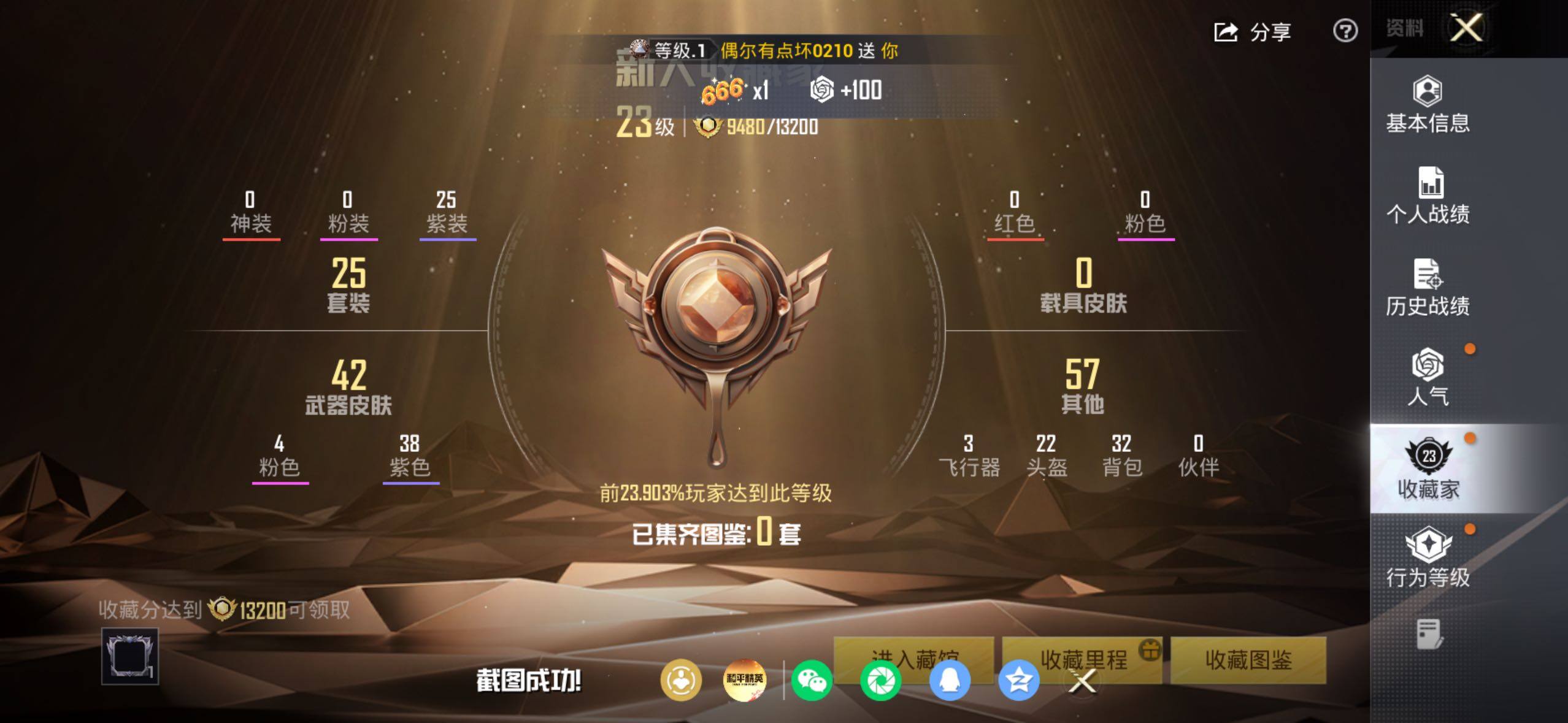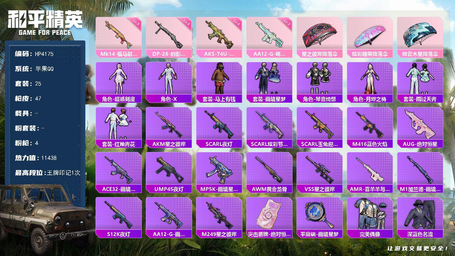 苹果 手Q-0粉装-4特效枪-0载具-0粉色飞行器-11438热力值-1王牌印记-25套装-47枪皮