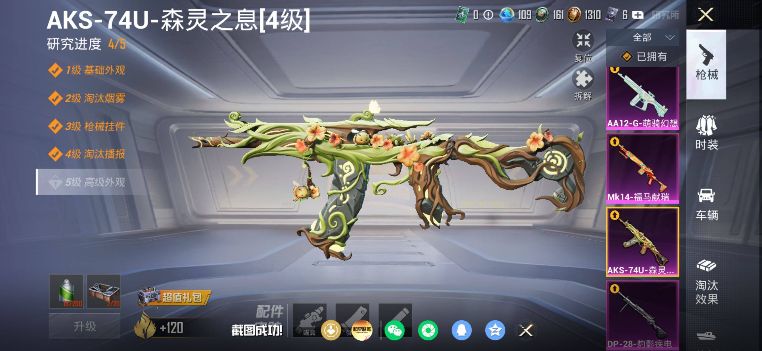 【粉色枪皮等级】:AKS-74U-森灵之息(四级),Mk14-福马献瑞(五级),AA12-G-萌骑幻想(三级),DP-28-豹影疾电(四级)