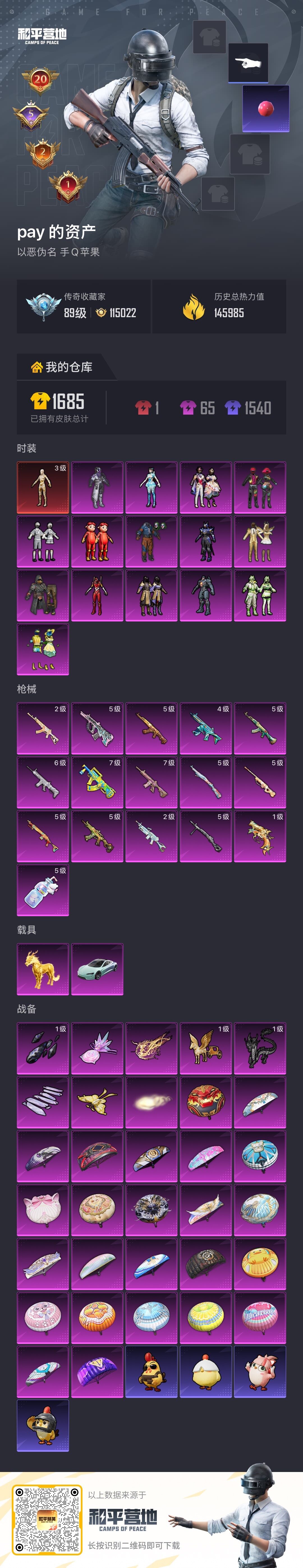 苹果 手Q-无敌战神框-1神装-15粉装-16特效枪-2载具-8粉色飞行器-145985热力值-20王牌印记-336套装-440枪皮
