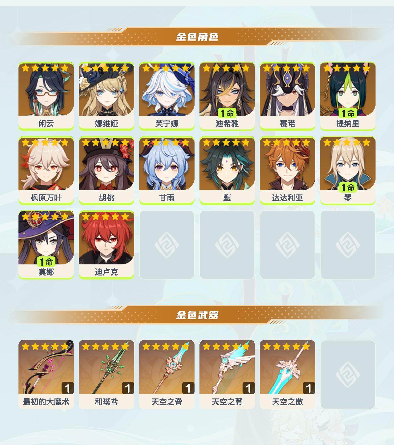 【YS1417】57级/23黄/女主/14个五星角色/5个五星武器/胡桃/枫原万叶/1命莫娜/娜维娅/魈/甘雨/达达利亚/闲云/芙宁娜/迪卢克/赛诺/1命琴/1命迪希雅/1命提纳里/最初的大魔术/天空之翼/和璞鸢/天空之脊/天空之傲