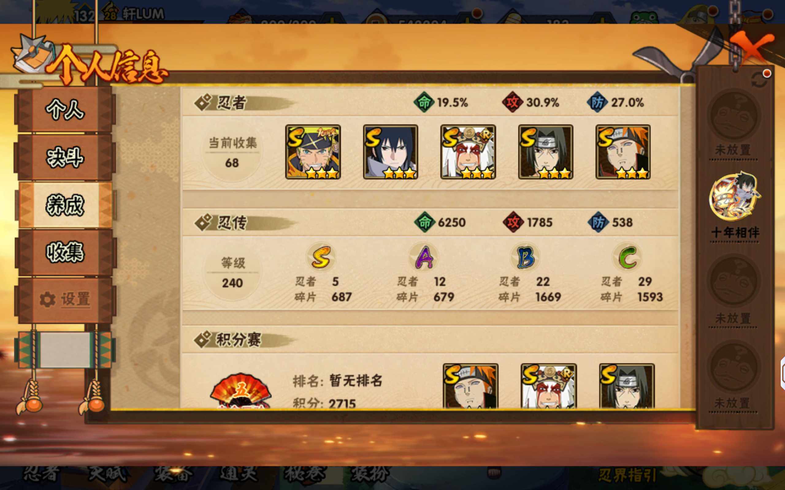 【S级忍者】:宇智波鼬「须佐能乎」(3星),自来也「舞之豪杰」(3星),佩恩「天道」(3星),宇智波佐助「永恒万花筒」(3星),漩涡鸣人·宇智波佐助(3星)