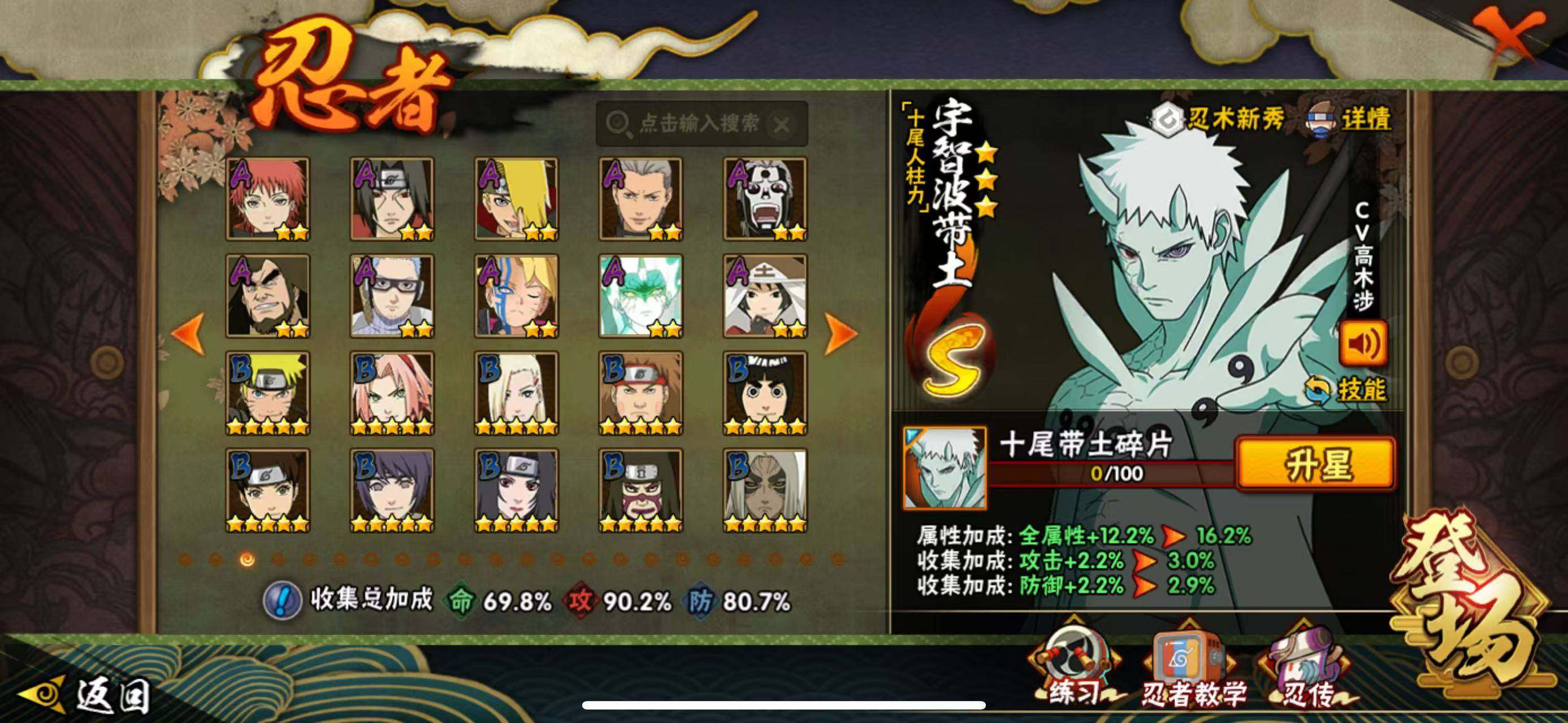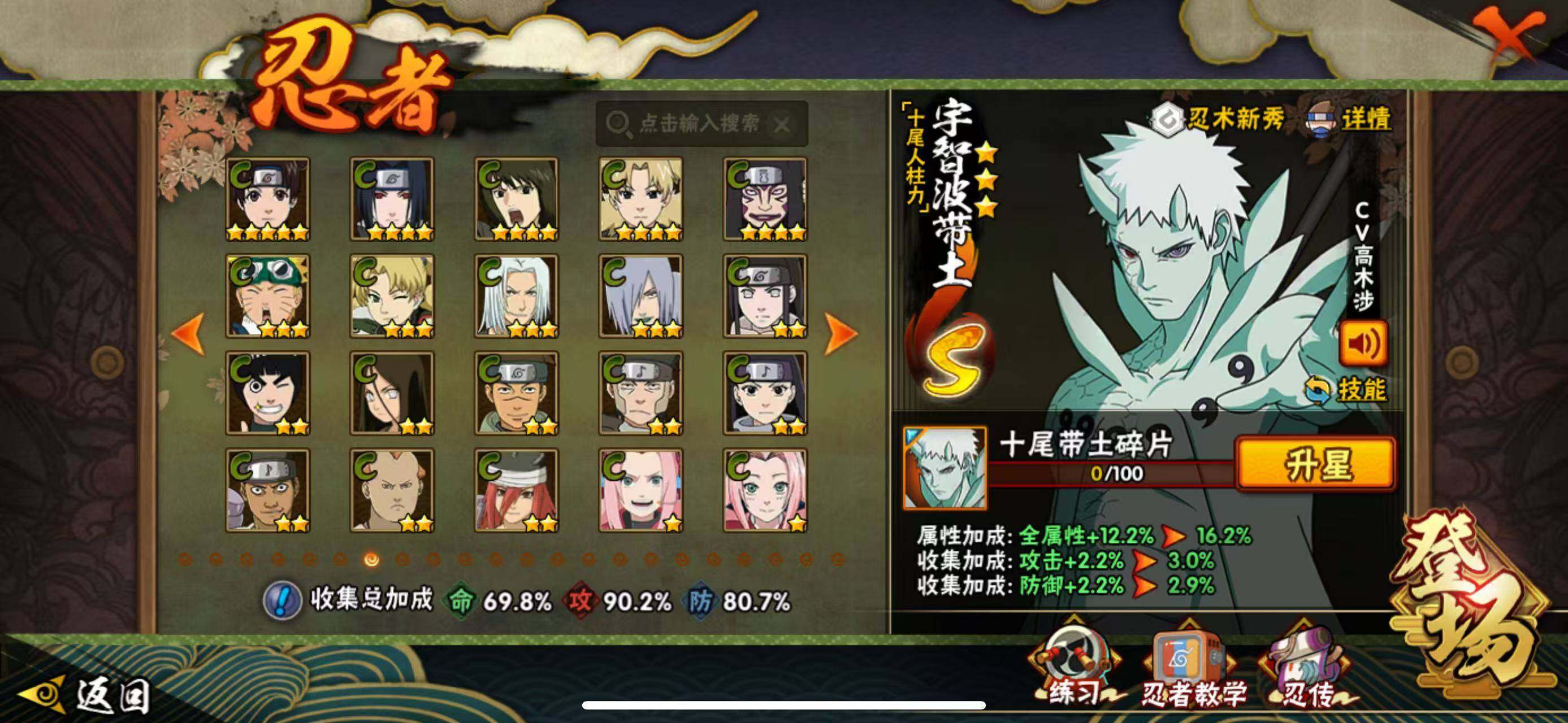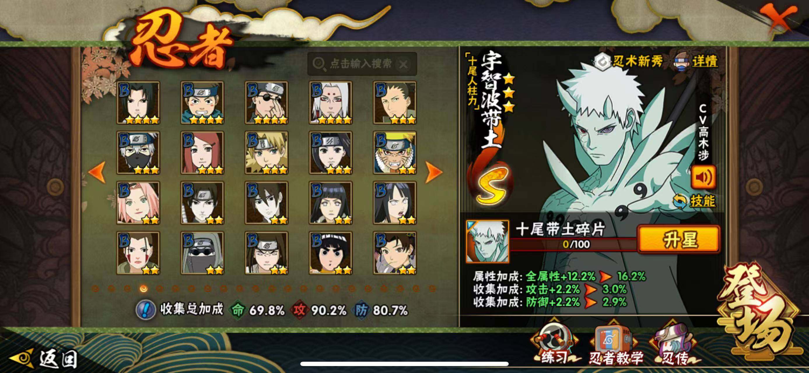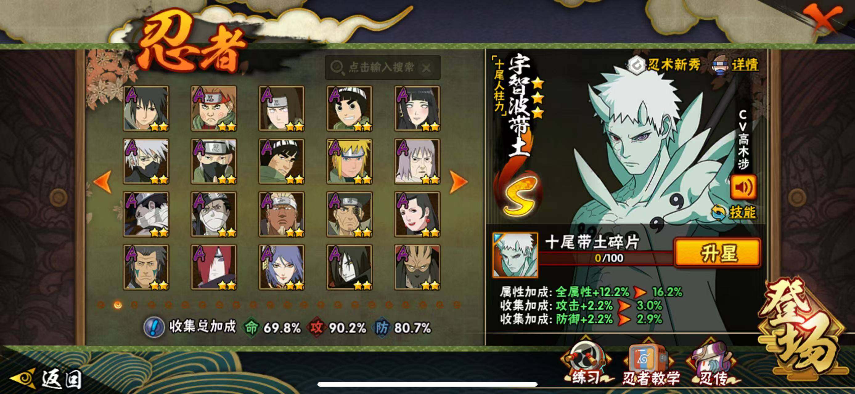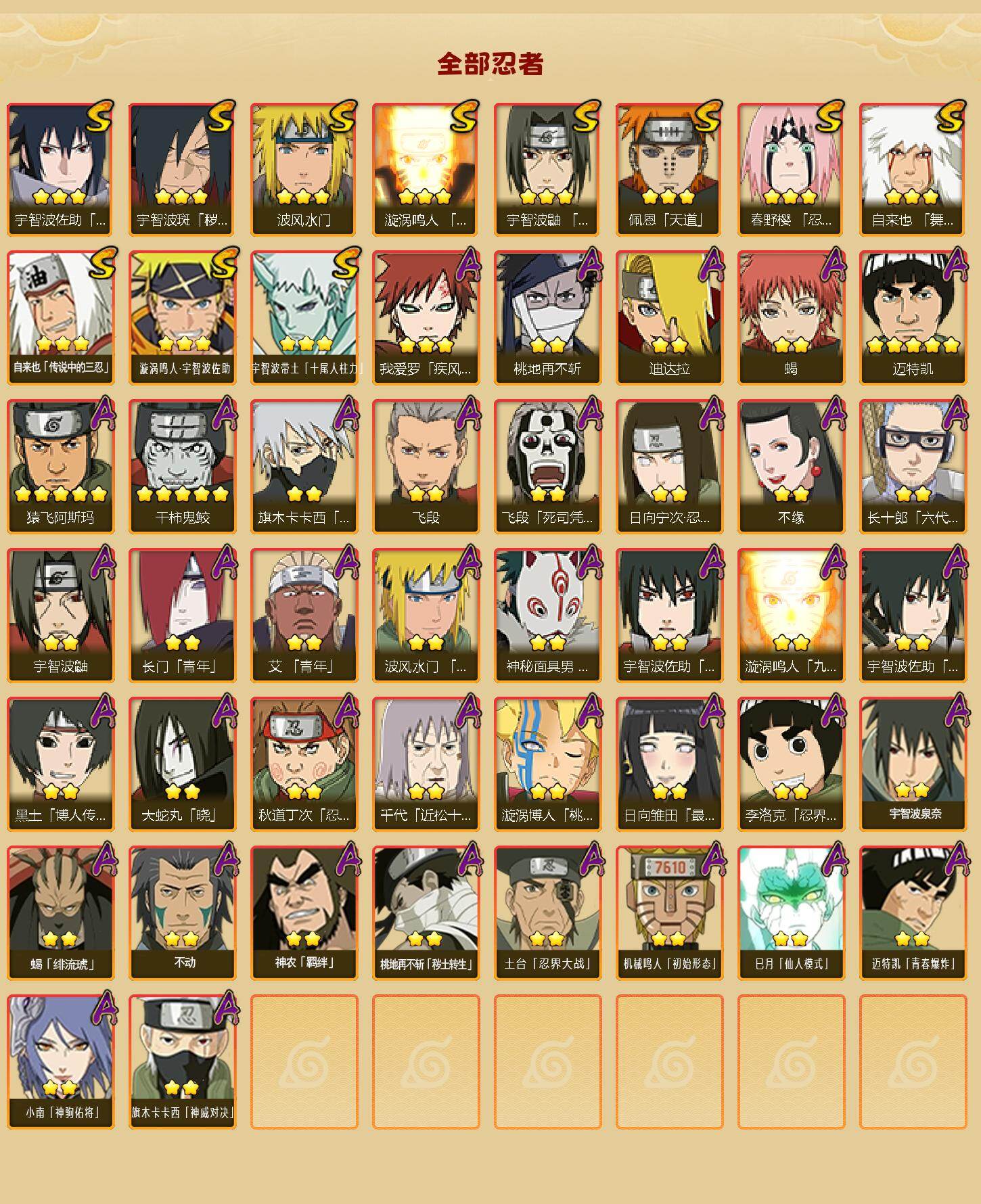 【S级忍者】:宇智波斑「秽土转生·解」(3星),春野樱「忍界大战」(3星),宇智波鼬「须佐能乎」(3星),自来也「舞之豪杰」(3星),自来也「传说中的三忍」(3星),波风水门(3星),漩涡鸣人「九喇嘛连结」(3星),佩恩「天道」(3星),宇智波佐助「永恒万花筒」(3星),漩涡鸣人·宇智波佐助(3星),宇智波带土「十尾人柱力」(3星)