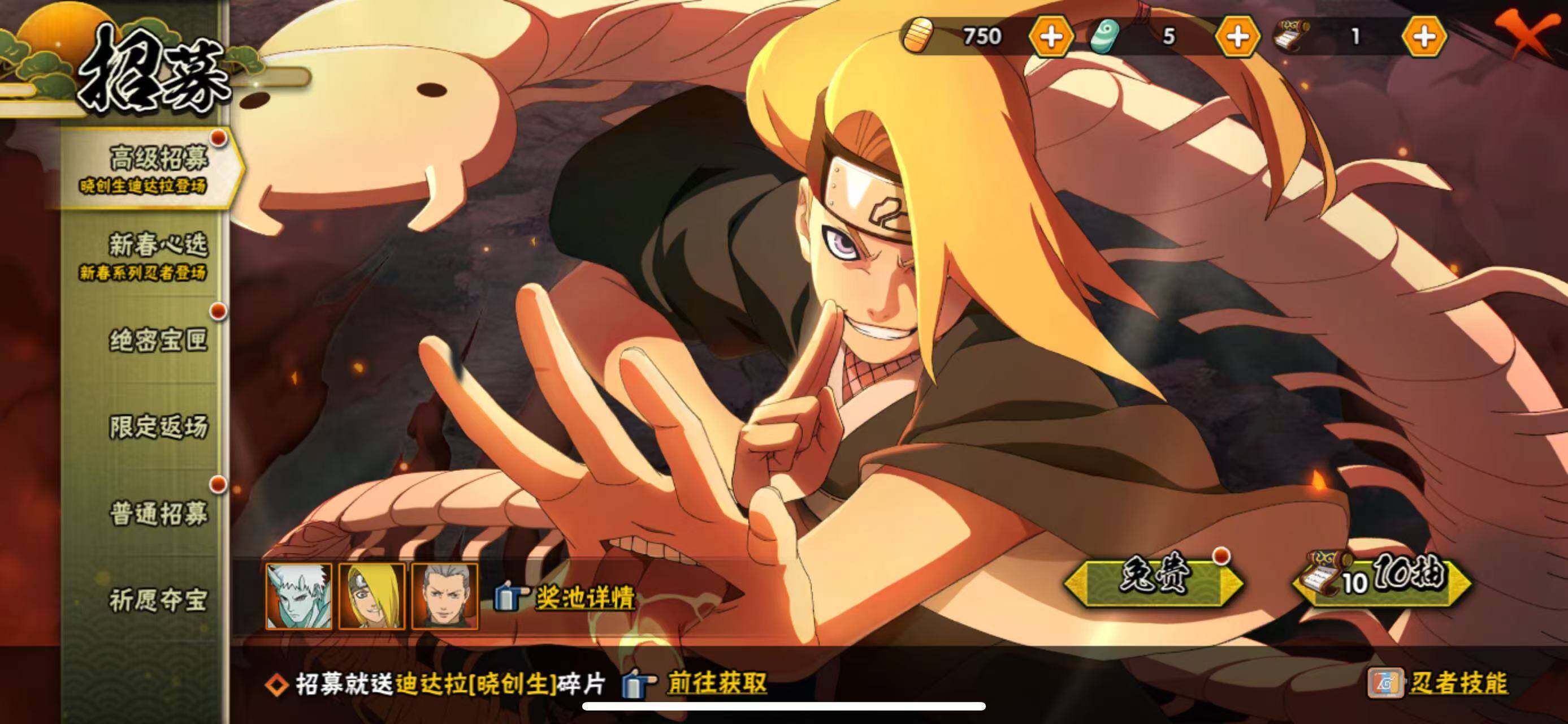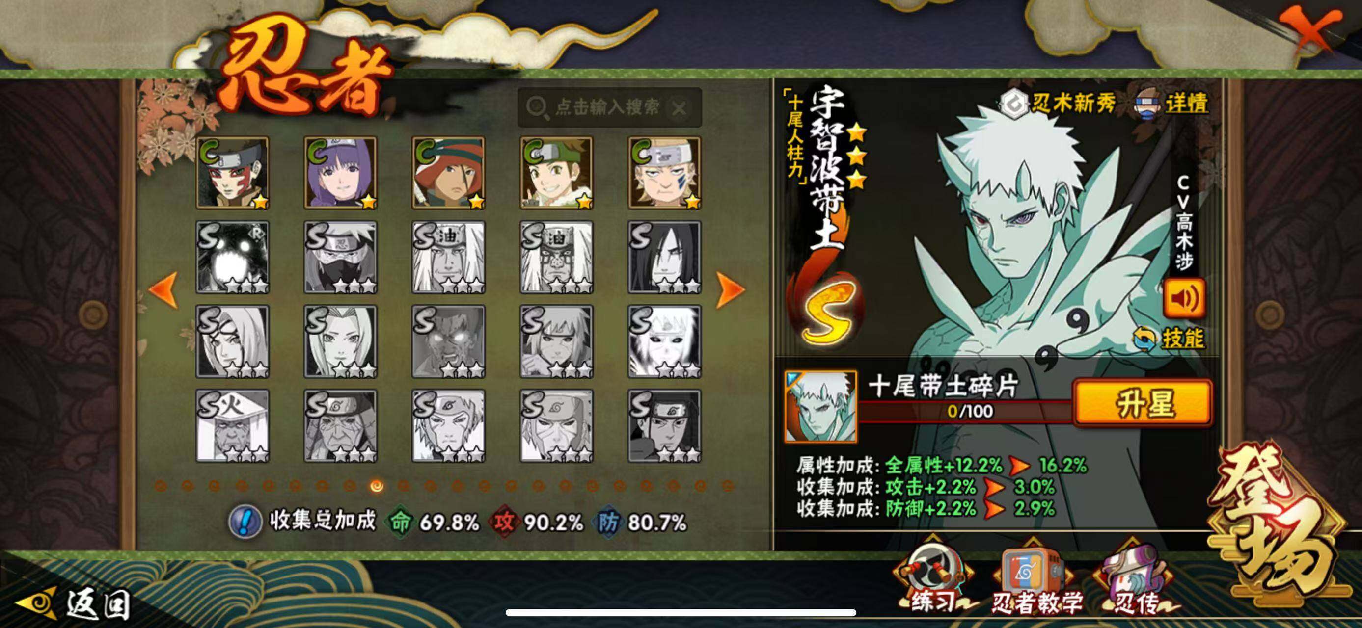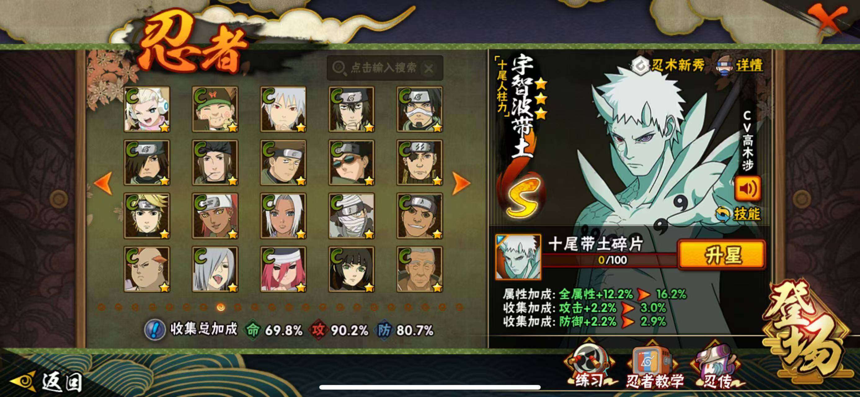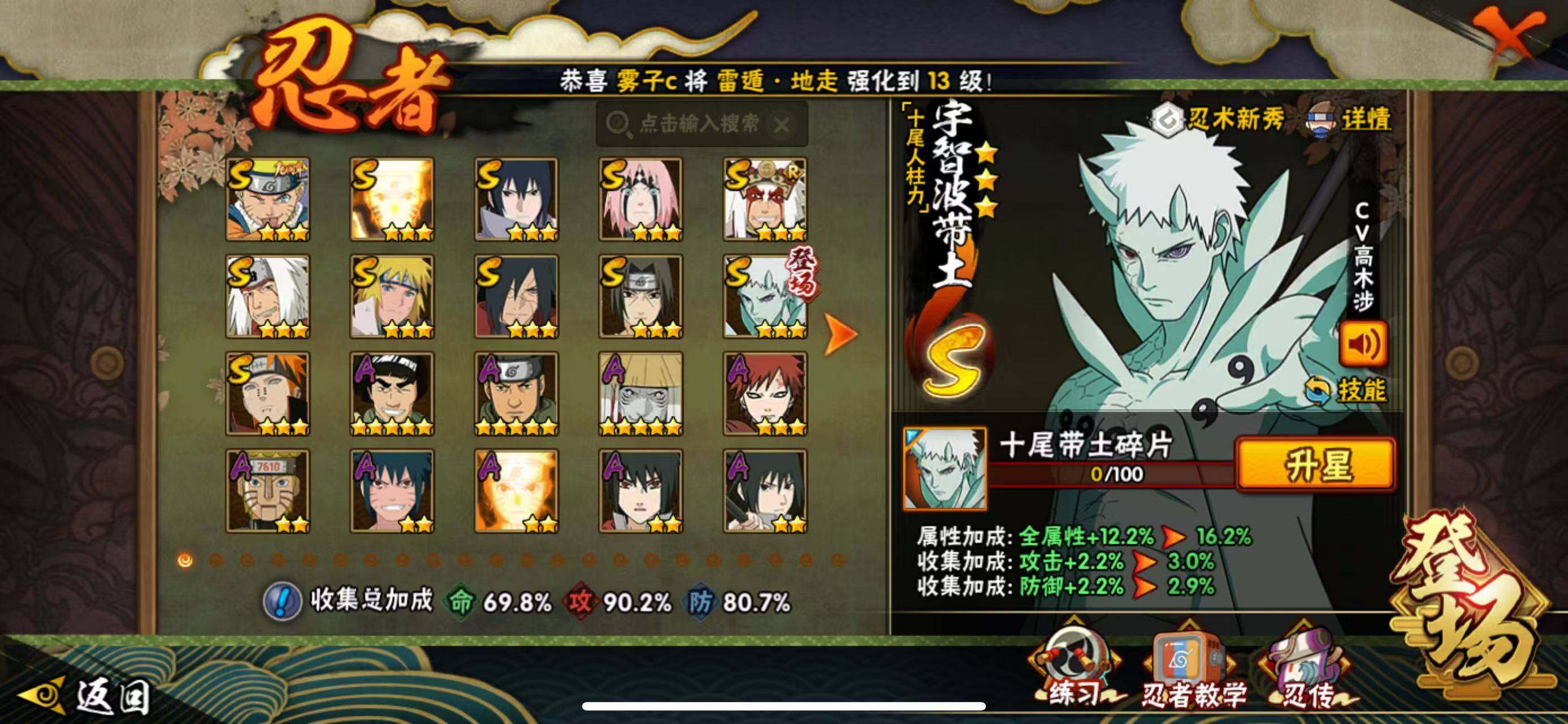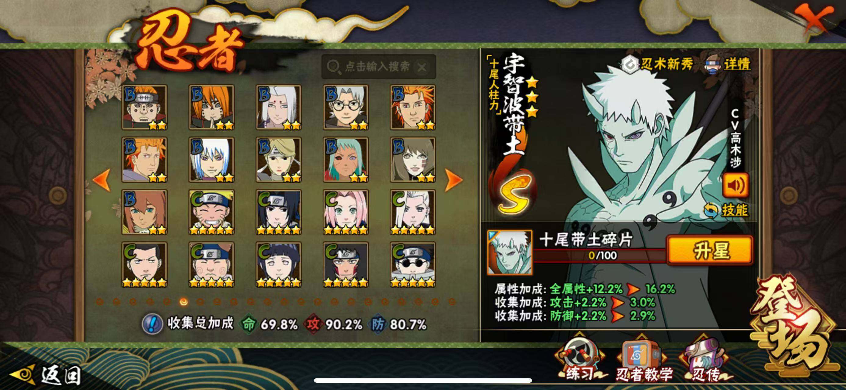 【S级忍者】:宇智波斑「秽土转生·解」(3星),春野樱「忍界大战」(3星),宇智波鼬「须佐能乎」(3星),自来也「舞之豪杰」(3星),自来也「传说中的三忍」(3星),波风水门(3星),漩涡鸣人「九喇嘛连结」(3星),佩恩「天道」(3星),宇智波佐助「永恒万花筒」(3星),漩涡鸣人·宇智波佐助(3星),宇智波带土「十尾人柱力」(3星)