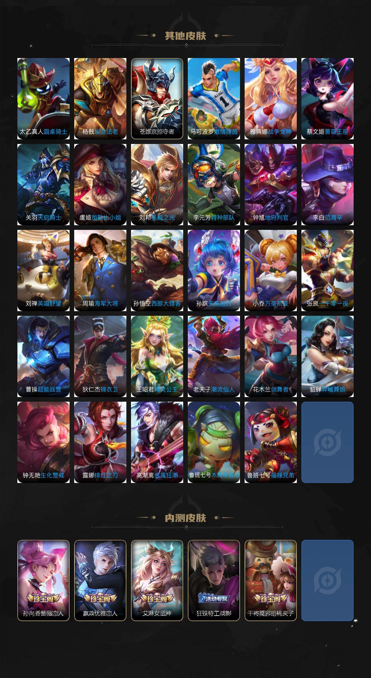 【传说皮肤】:孙尚香乘龙问璇玑,大乔挚爱花嫁,鲁班七号寅虎瑞焰,西施游龙清影,公孙离祈雪灵祝,镜炽阳神光,孙悟空零号赤焰,刘备时之恋人,伽罗太华,后羿黄金射手座,孙尚香末日机甲