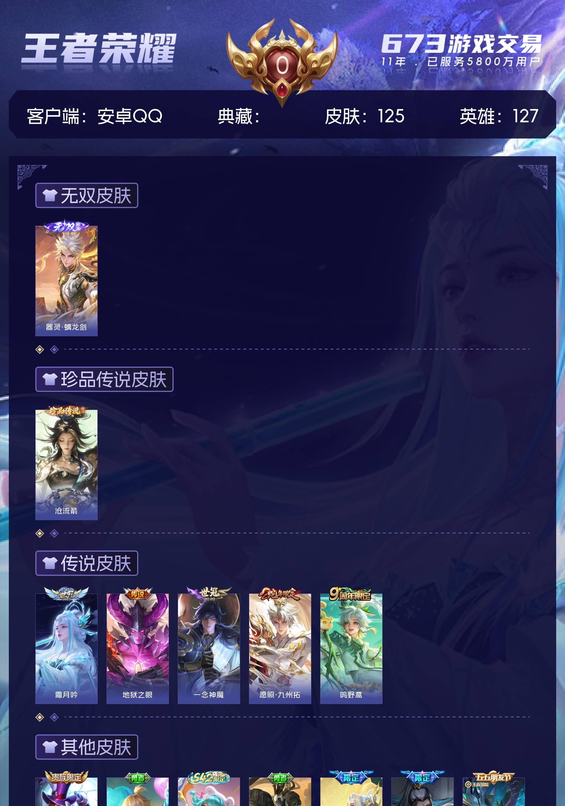 皮肤125 英雄127 至尊星耀 无双皮肤1 珍品传说1 传说5