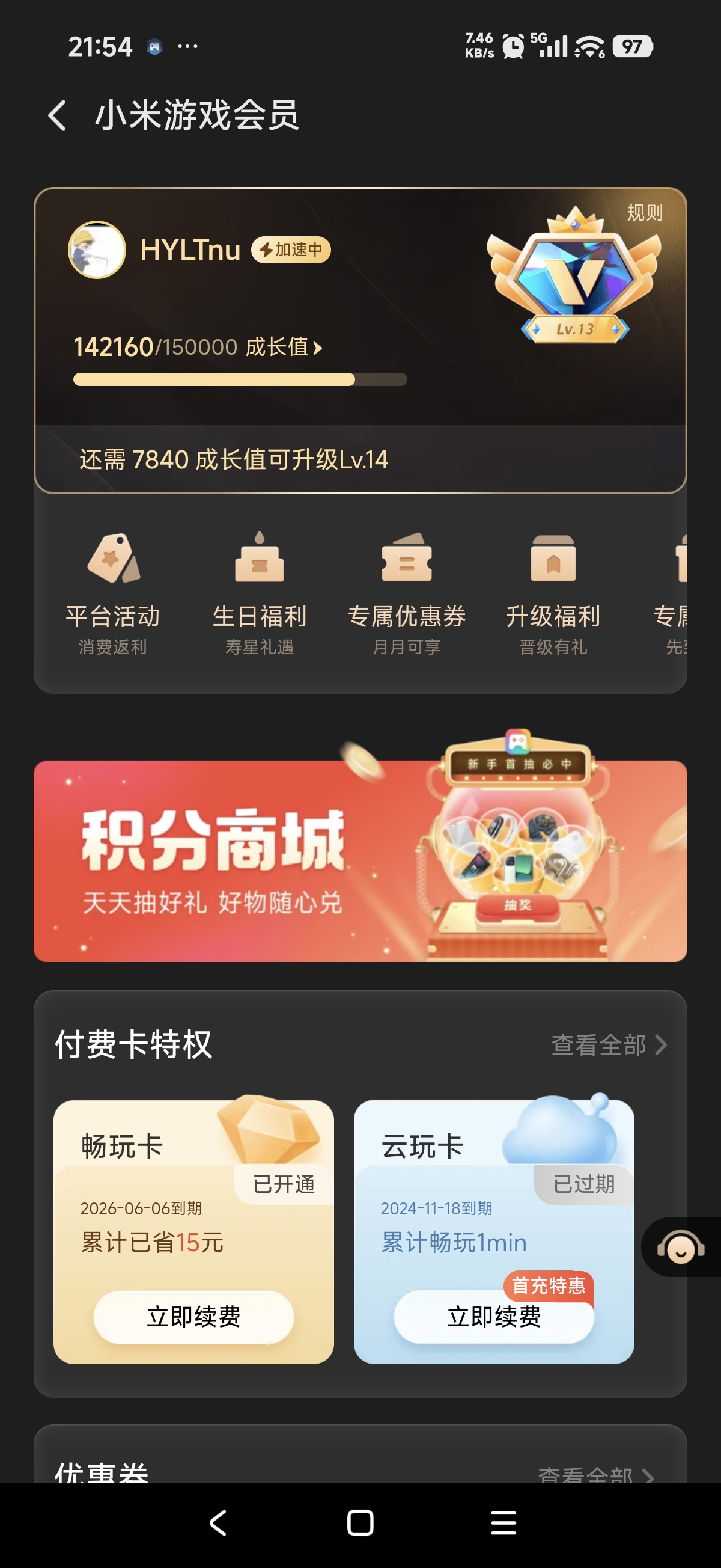 小米版本准V24,2257加成84.8返点券每个月都有充值优惠券