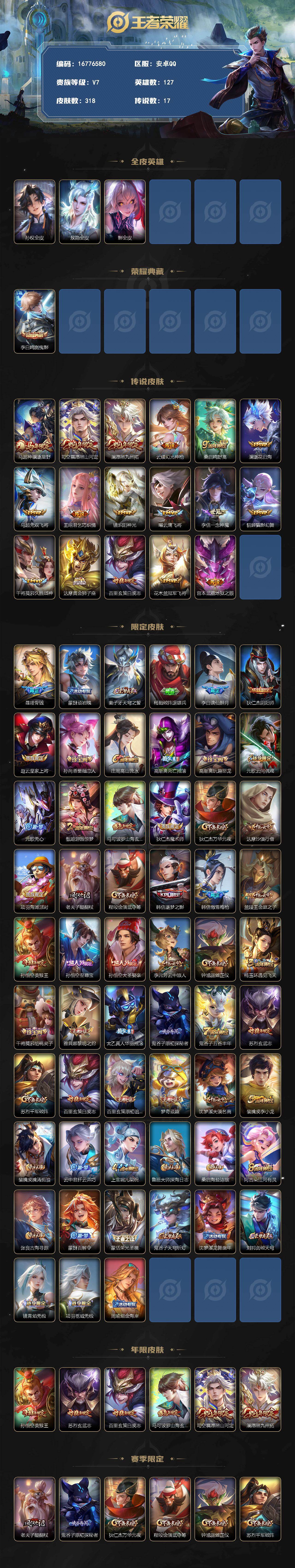 【16776580】安卓Q-V7-至尊星耀I段位-127英雄-318皮肤-1典藏皮肤-17传说-77史诗