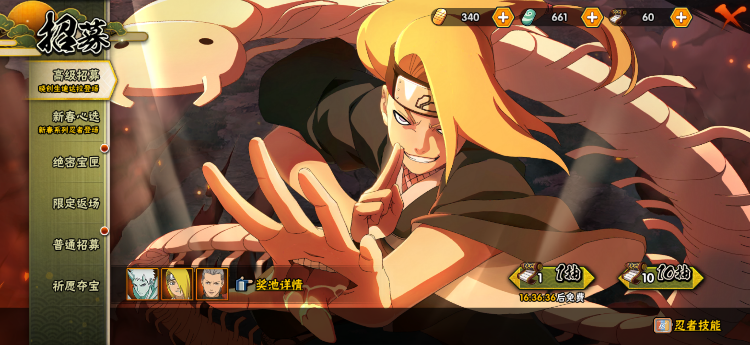 充了1万5该有的啥都有还有60张招募券,这个赛季买了大忍法帖,边挂边玩不急出